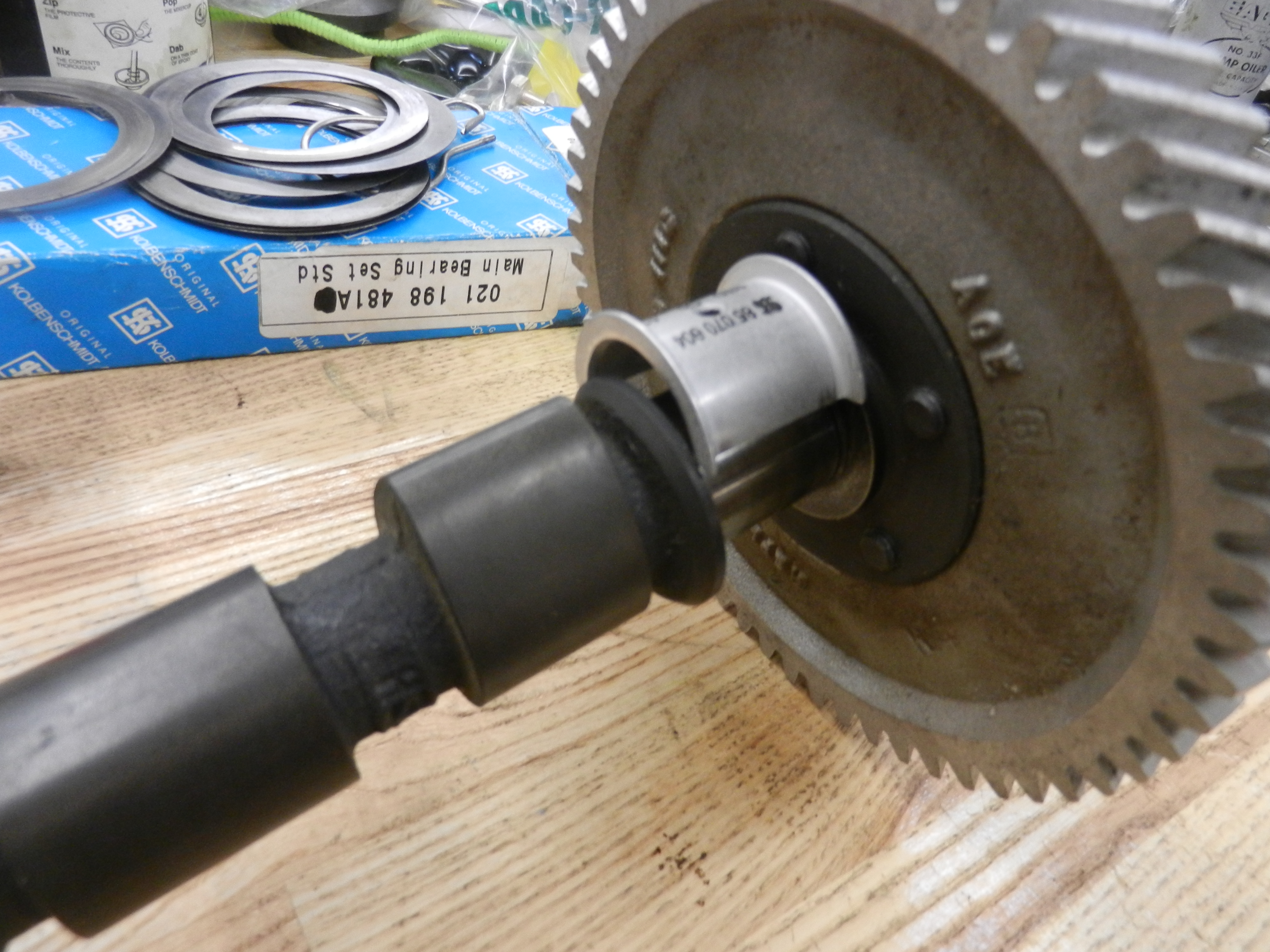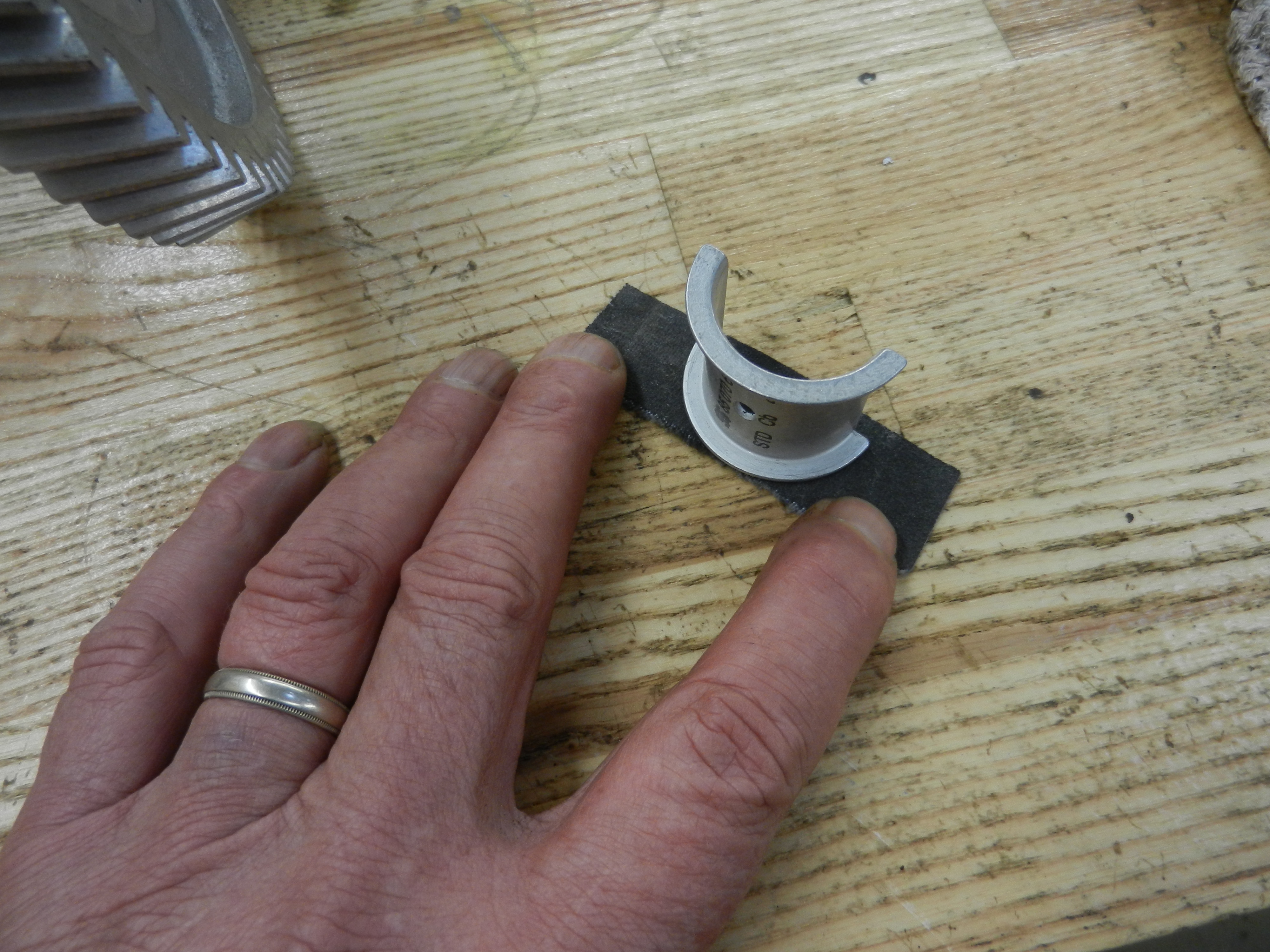 There are 3 cam bearing journals and 6 cam bearing half shells. 5 of them have locating tangs, 3 in the right case half and 2 on the left. The 6th bearing shell is a thrust bearing. fits nice and snug. Now, we are going to try it on the camshaft. Problem. This is the 3rd build I have had this issue, with 3 different camshafts. a couple of solutions. Work the bearing on some fine emery cloth. Or, try another thrust bearing. Another bearing, also a Kolbenschmidt, fit fine.
