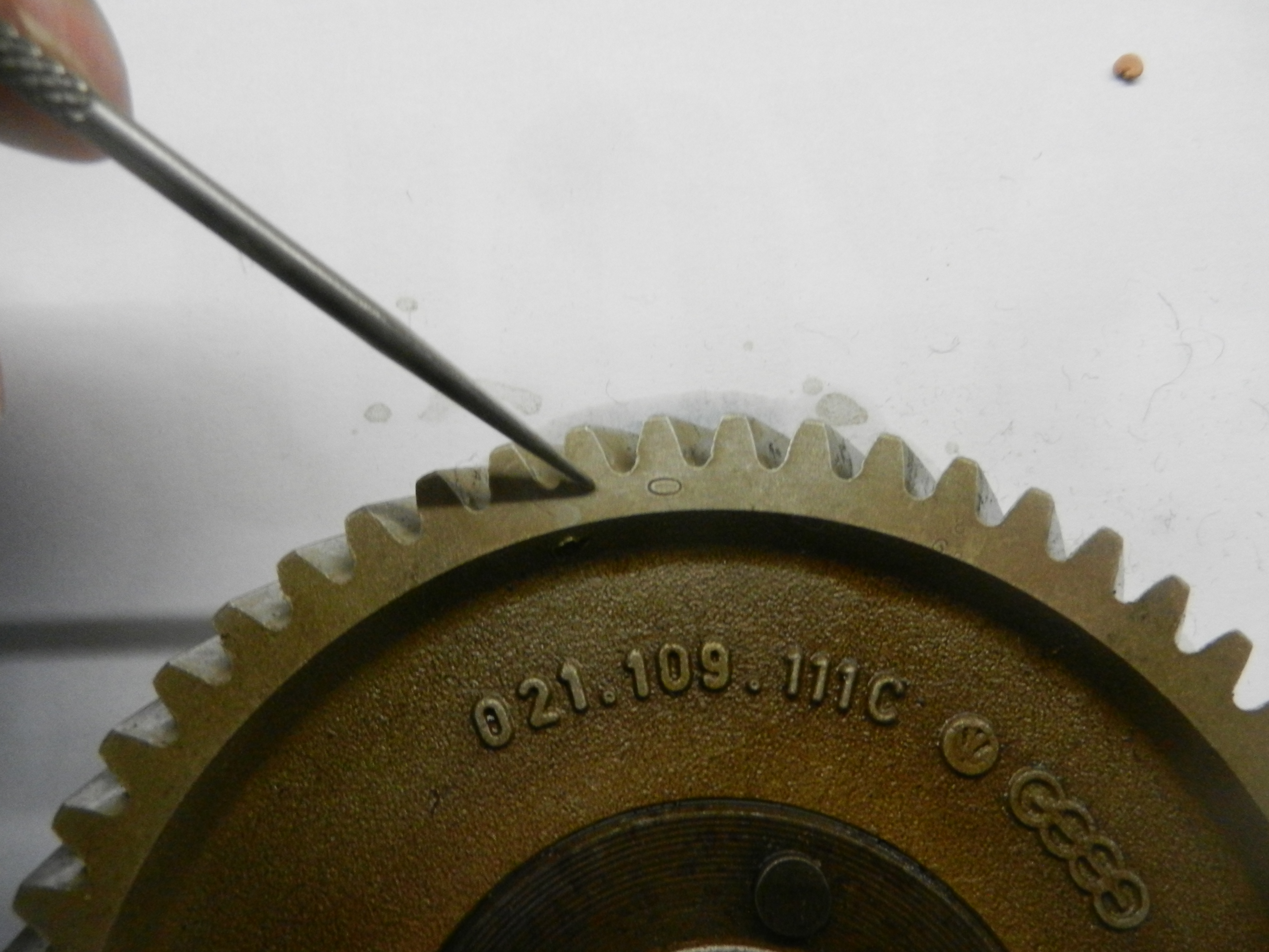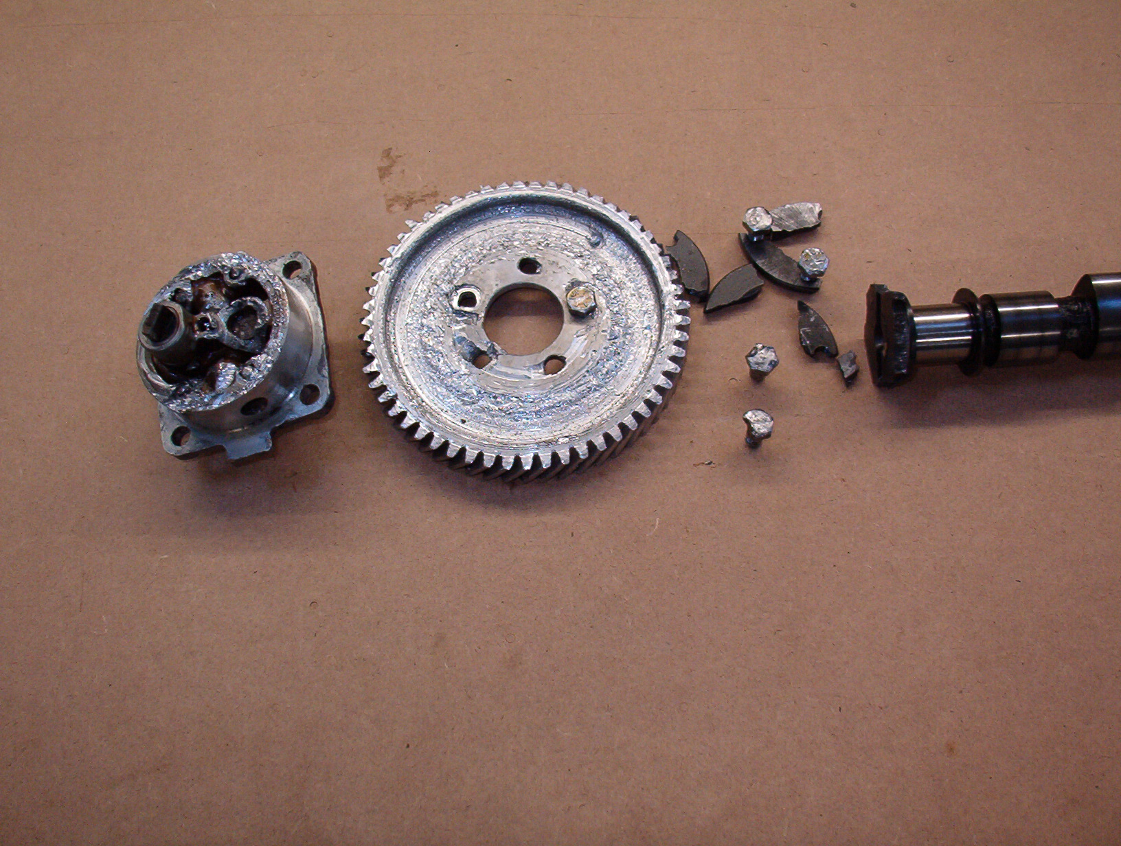 One more thing to check. The oil pump. Type 4 oil pumps are no longer available. They have 24mm gears. I won't waste any time explaining disassembly and inspection. Don't use it. It is between 37 and 47 years old and probably 100,000 plus miles on it. And there will be a clearance issue with the bolts on cam gear.
