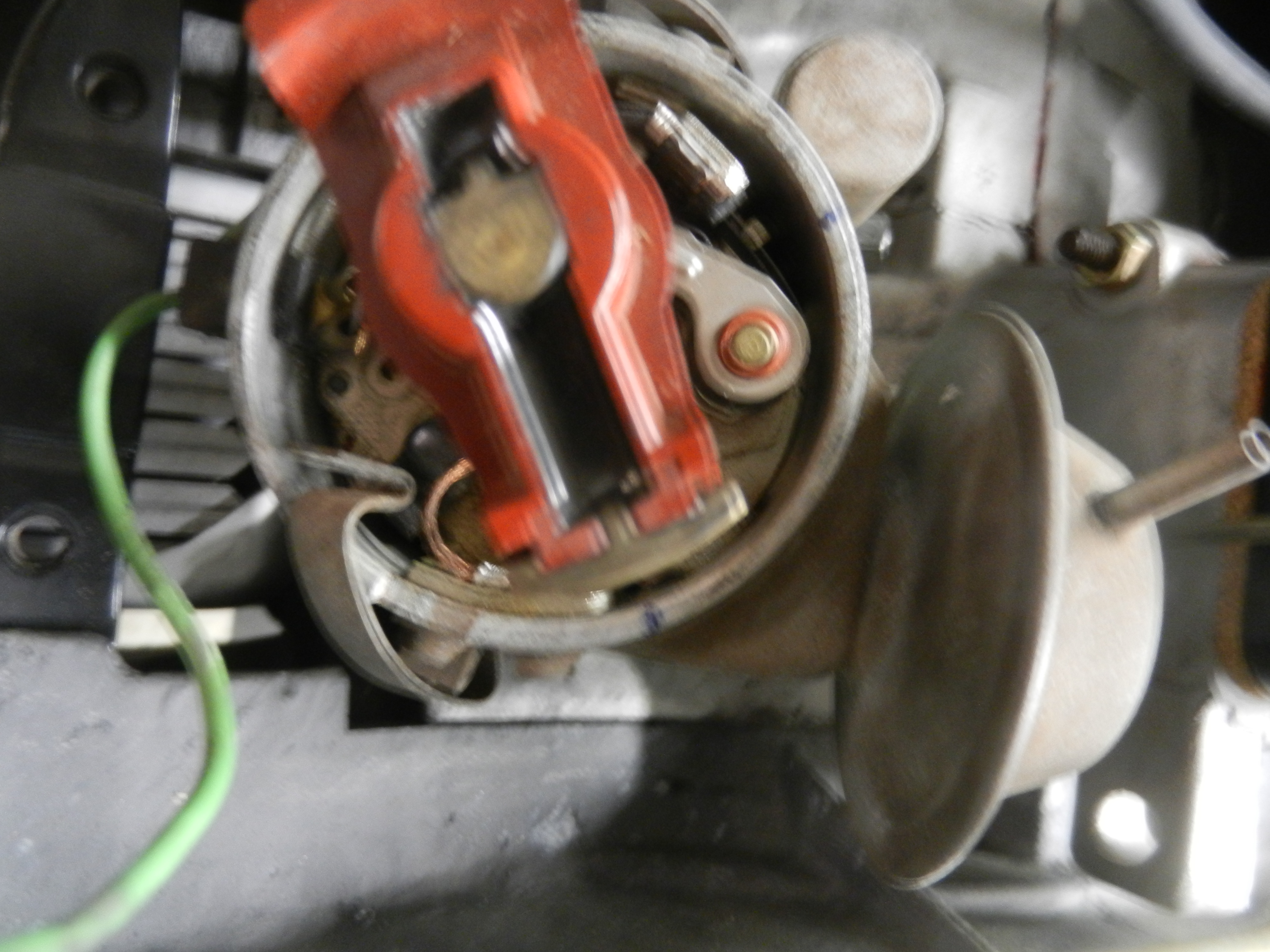 At this point, with #1 rod at it's full out and the heal of the cam facing out, you are at TDC for #1. I like to put a mark on the flywheel at the case seam. and note the location of the woodruf key on the nose of the crank, which should be at 9:00. Then, install the distributor drive gear and spacer and distributor, orienting the distributor to the notch in the distributor body. Type 4 drive gear uses 1 spacer and installs at 12 degrees from the case parting line. a little white grease holds the spacer on to install. A little polishing,and some lube. Install. Now we can find TDC #1 as we proceed, next time