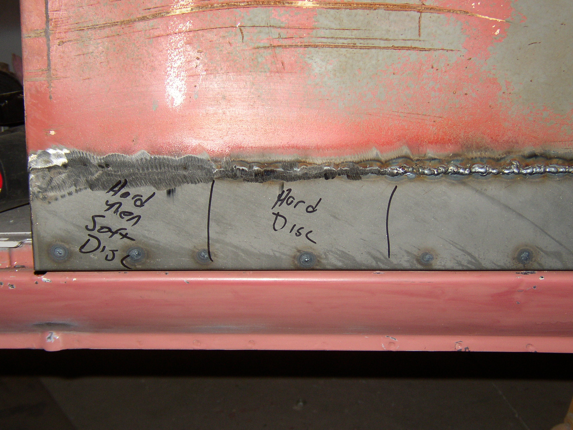 On the right is the weld, in the middle I've ground it out with the hard disc, and on the left I finished with the flap disc.