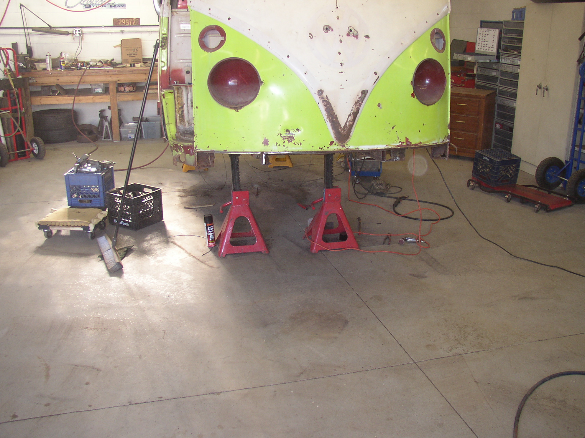 I took the column, package tray and doors off. Looking pretty empty up front right now, I can easily lift the front of the bus off the stands by hand. It's so light it's wobbly on the jackstands because there's not enough mass to keep it stable. I have a safety chain looped through the windows to an overhead beam in case I pull it off the stands while I'm working on it. Scary.