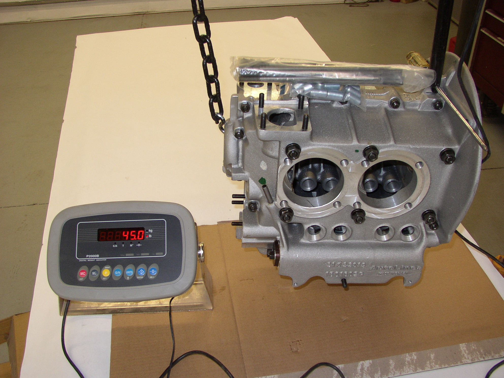 A fully trimmed engine is about 240 lbs. The reason I have a scale like this is for my cutaway diesel engines with a 3000lb limit, I know it's accurate because if I hang on the cable it shows my weight, 220lbs.