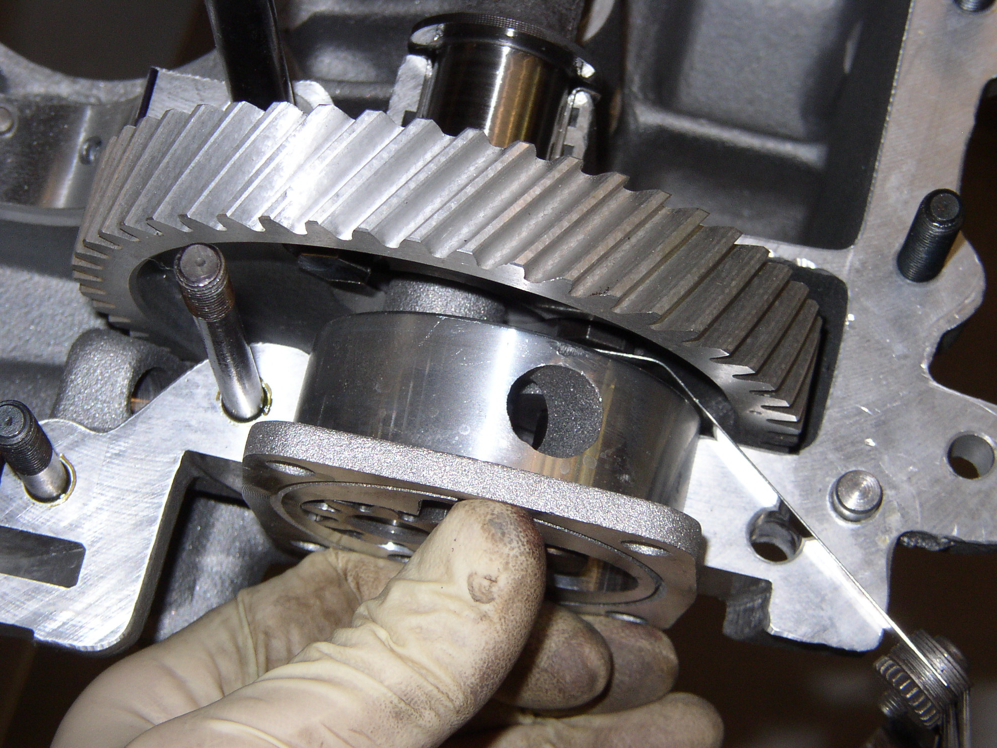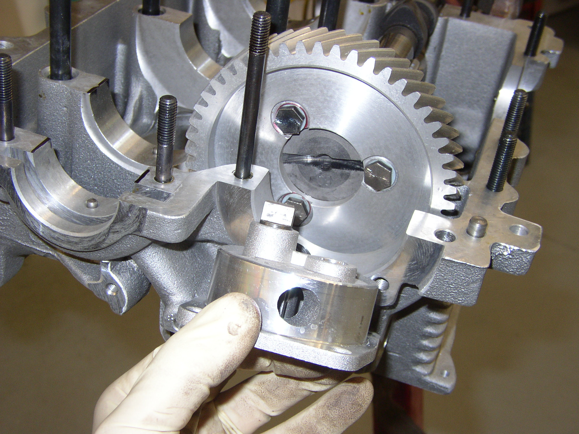 Everything went pretty smoothly for the first mockup, the crank set in, cam gear backlash was spot on, and I checked clearance to the CB Maxi Pump because usually there's a clearance problem there. In previous engines the cam bolts hit the pump body, on this one they did not but clearance was under .010". I ground the heads of the bolts slightly for clearance and torqued them with red Loctite.