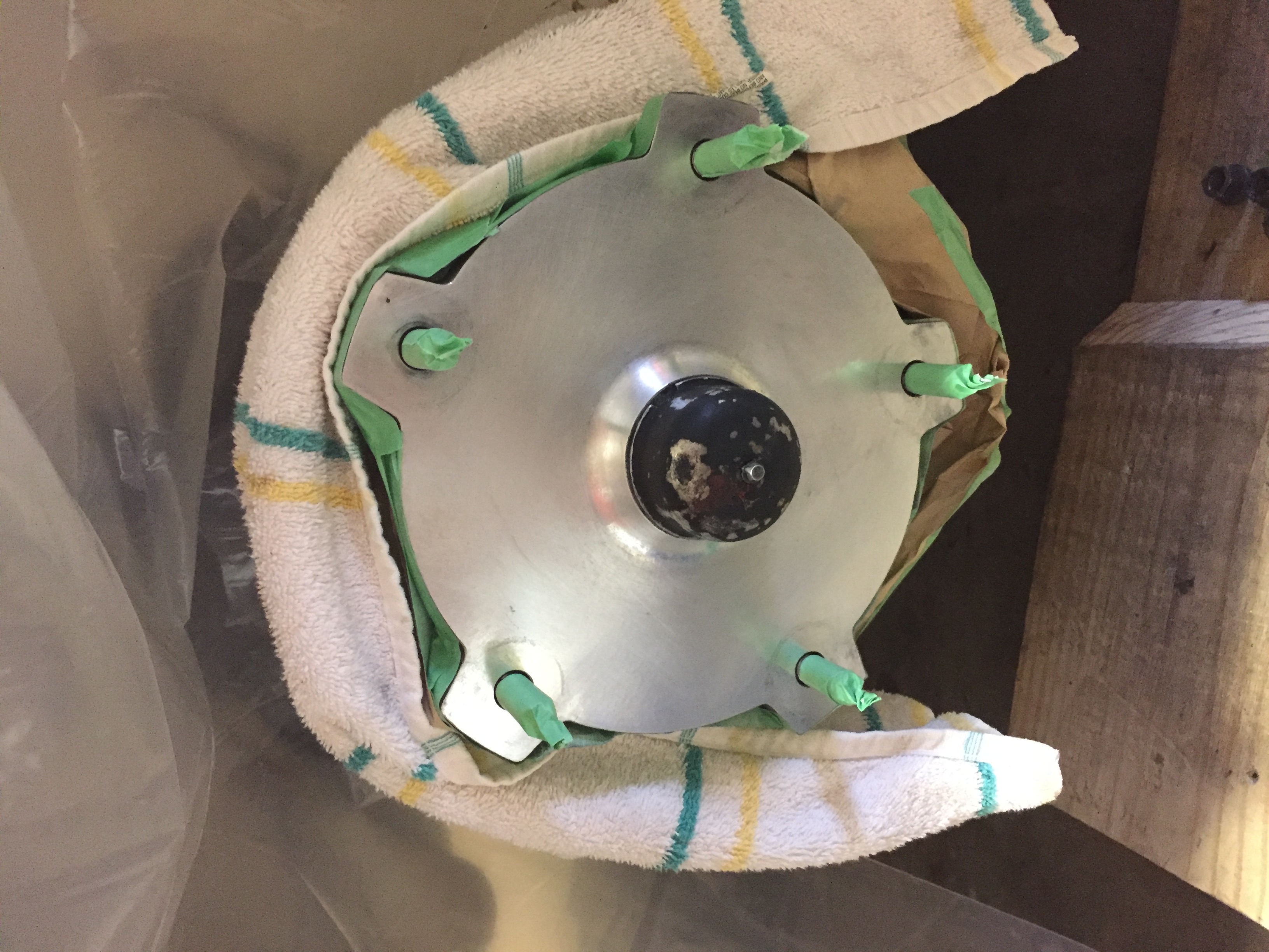 For a picture I set the cal on the top of the rotor, which would have worked too. Keith pumps the tool while I make crude jokes about strokes and fluid coming. Bled all four twice, it took a little longer than my bus or Sean’s, probably a half hour. Once bled, the cals can be bolted on for good with Loctite.