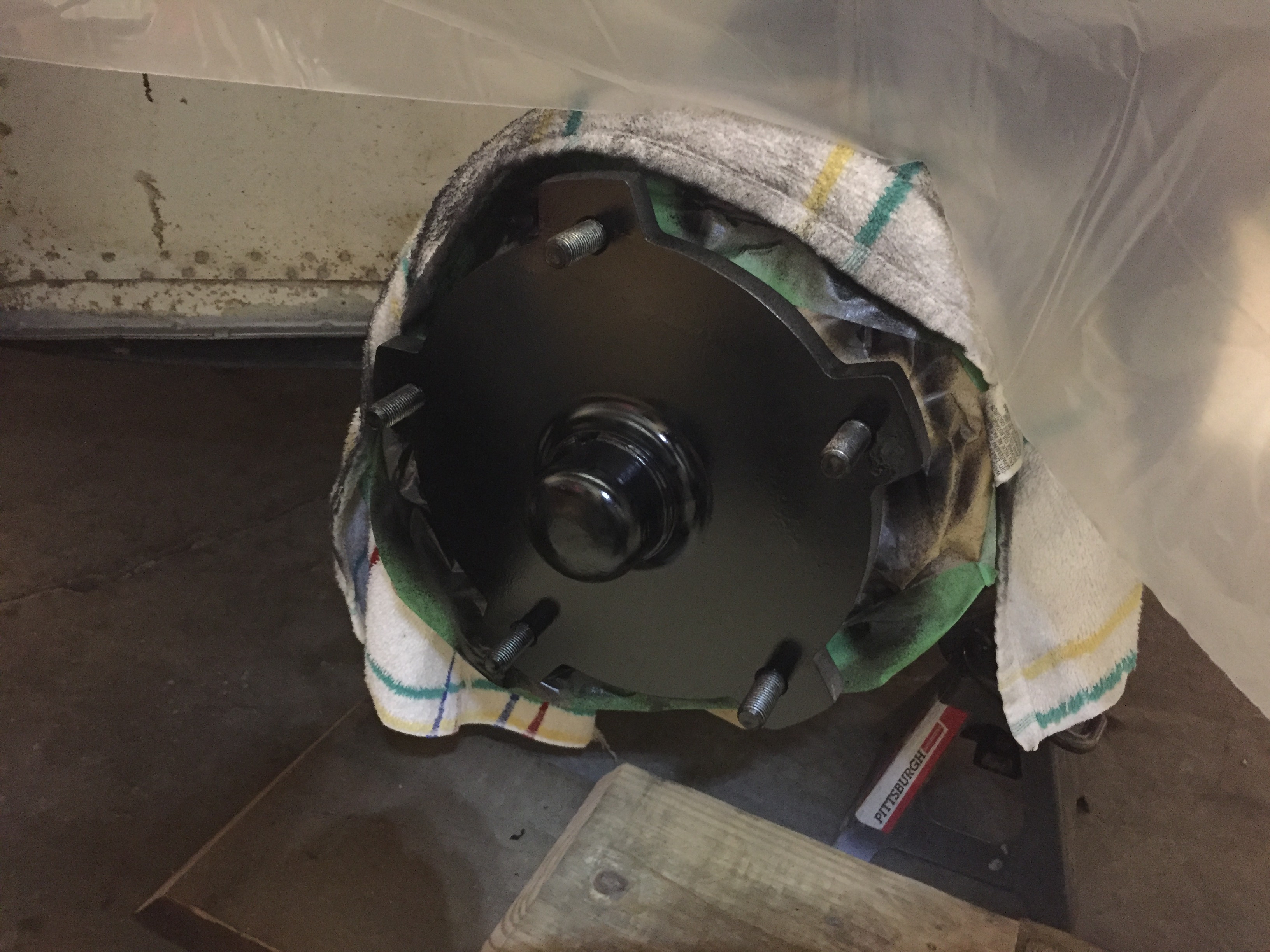 I prepped the wheels with a simple speed-blast gun from Eastwood using sand for the abrasive material. The old paint was gone in no time. I also used 220 grit to get the rest, then scotch brite to prep them for paint. I was not happy with the Eastwood primer paint at all. It didn't cover like I thought it should and took both cans back. I really think it was a bad batch. Two cans of Krylon gloss black and here they are. Two portable heaters in the garage to get the wheel surface somewhat warm on a frigid day in the garage. Since my garage barely fits the car, I covered the car with everything I could get my hands on to keep any overspray off. There was just enough room to set a wheel on the floor beside the car to paint. Plus a fan propped up at the doggie door on the garage door helped with ventilation. It actually works pretty well.