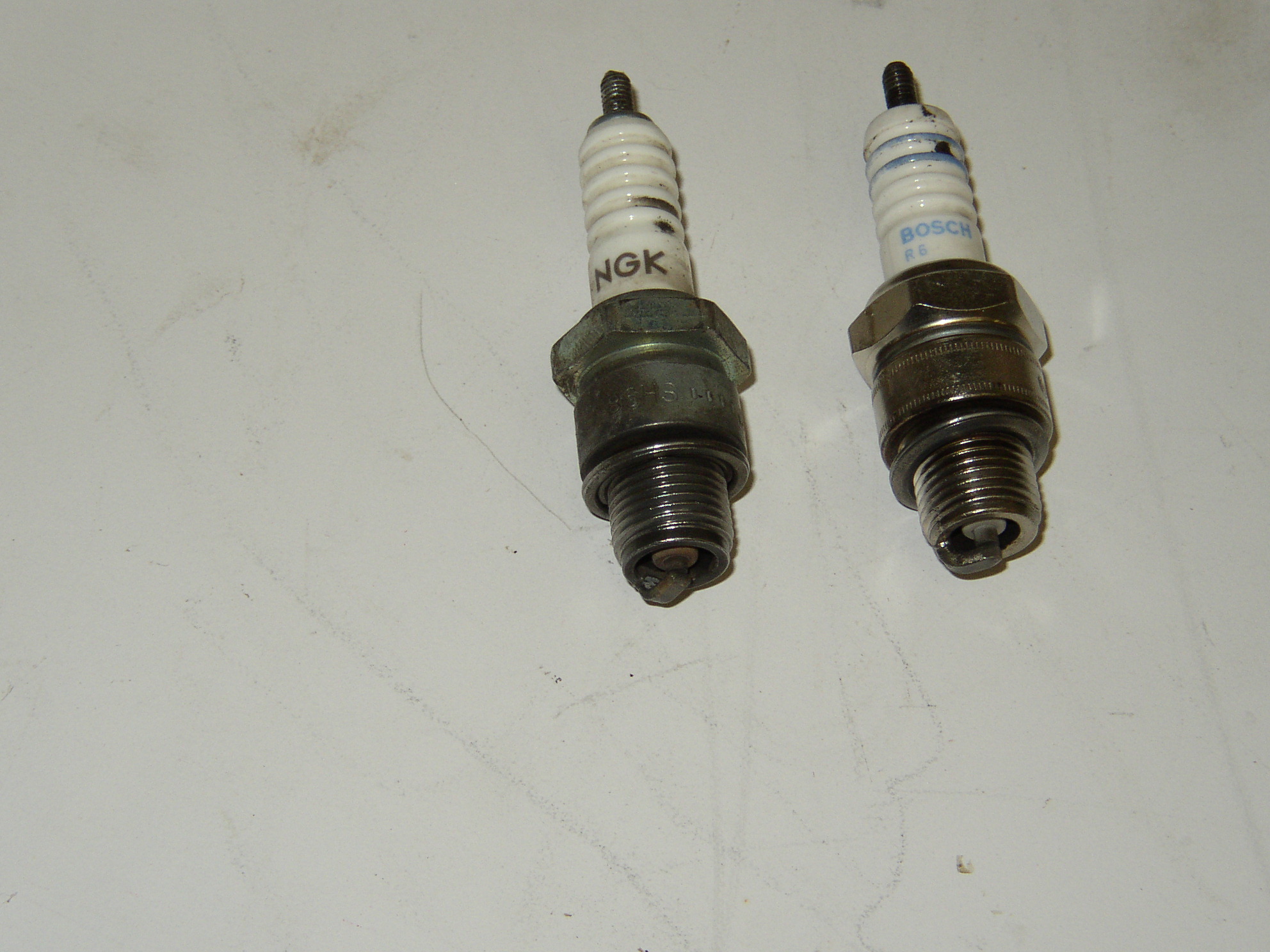 It's got about 4-5 hours run time on it now, but it wasn't sounding perfect- random constant misfire at steady RPM. I check a bunch of stuff and come to the conclusion it's the new Bosch plugs, but how can that be? I yank the Bosch and put in a set of USED NGK's and it runs much better! WTF!