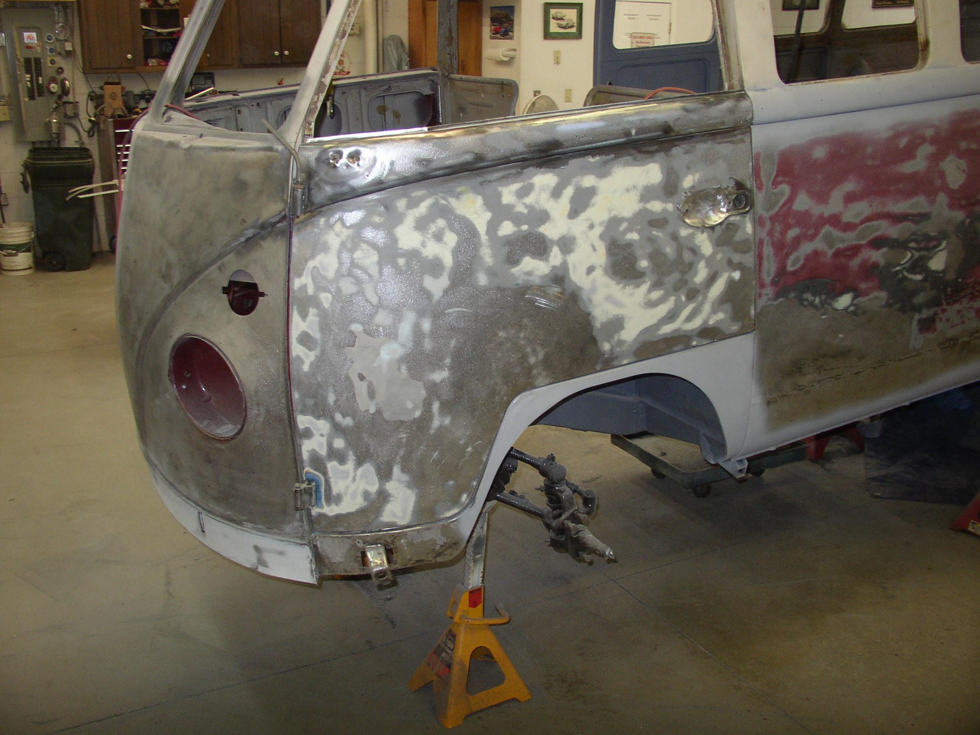 I removed the Bondo from the dent in the middle and worked it out from the inside, it came out quite well and will only need a skim coat instead of the 3/4" it had. I stripped the paint to find many coats, this was a '67 Deluxe door- it looks like the original bus was yellow bottom, white top, and repainted blue, but there's no factory yellow color in splitties, so I guess it changed color at least twice in its life. There might be 7 layers if you count primer- 2 blues, yellow, and white.