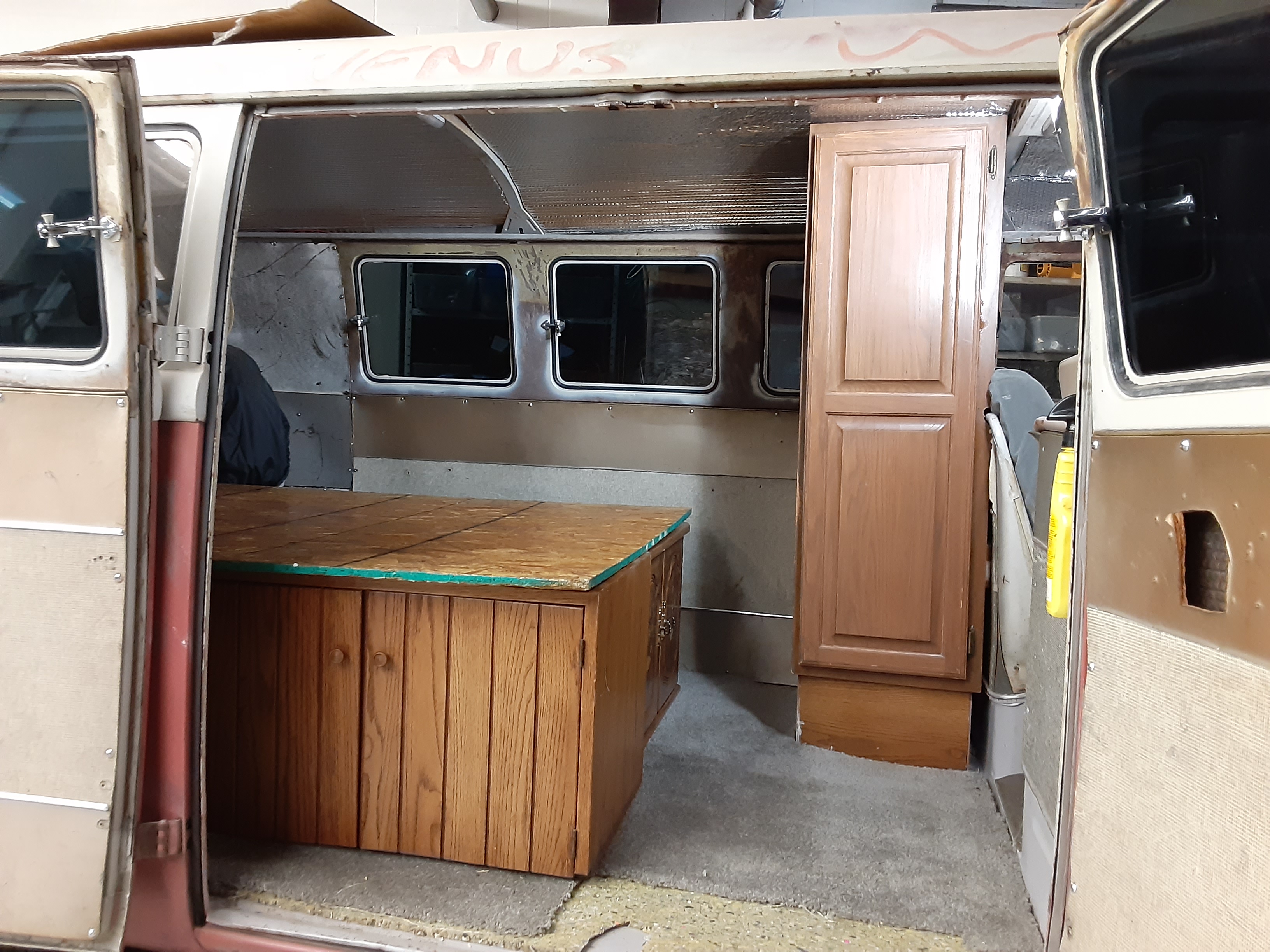 OK, now to the interior. When I go camping in this bus there's no storage space so it looks like a giant shithole when I open the doors. Shit everywhere and nothing put away because there's nowhere to put anything. Let's fix that, but on a budget and on my terms. A real Westy wouldn't work well for me because of my size, I roll around a lot when I sleep so I need a full width and length bed. I budgeted $10 each for cabinets, let's see what I can get done for that. First, I'm going to get rid of that "X" brace holding the plywood bed frame up and replace it with cabinets for storage. Old TV stands work well so I bought 2 for $10 each, one off CL and one at Habitat for Humanity in Cleveland. H4H has a location in Medina but the west side location has 10x the stuff at a fraction of the price. Go figger. They're not the right size so I cut them down to the 19.5" tall needed to make the bed level, pretty easy for some guys but I'm not a carpenter or cabinet maker so it's a challenge for me. Every minute I spend with a wood saw in my hand reminds me how terrible I am at woodwork. Anyway, I get the cabinets shortened to size and I cut the backs out of them so I can access room behind them too. This is real butchery so when you see them in person keep your mouth shut and don't remind me how shitty they look.