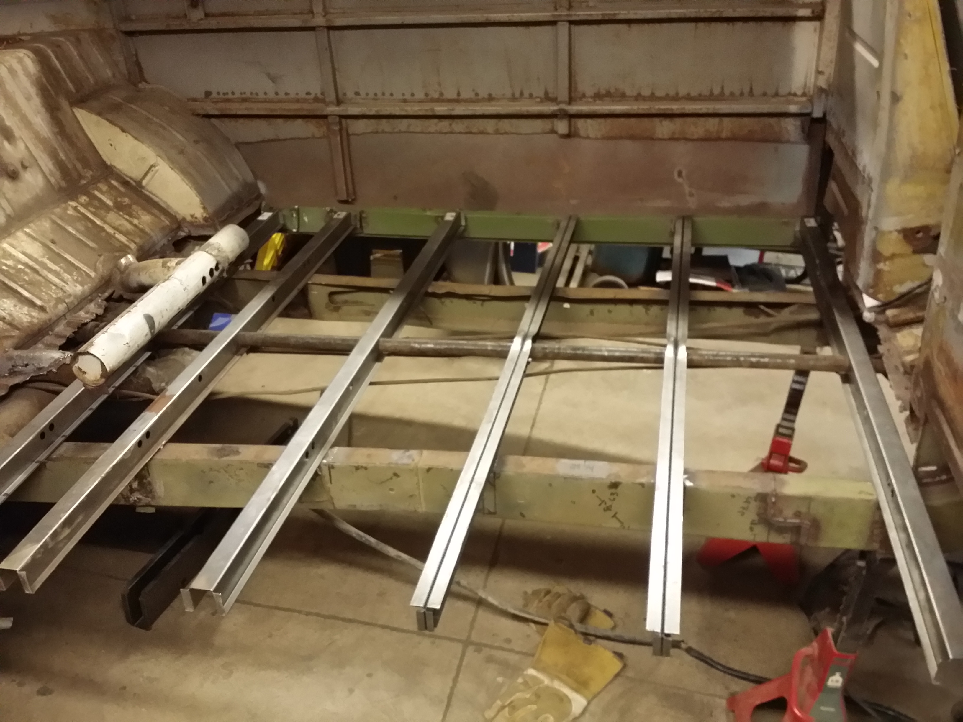 Take a look at where the 3rd I beam should be ..there is a tophat there.. strange to me maybe its a 67 only thing Anyways I took some measurements and started cutting then laid it all out numerous times and finally tacked it all in Things were going pretty smooth so I figured I might as well work while the body is good I predrilled a bunch of holes and Eric came over on Sat and we plugged some wire.