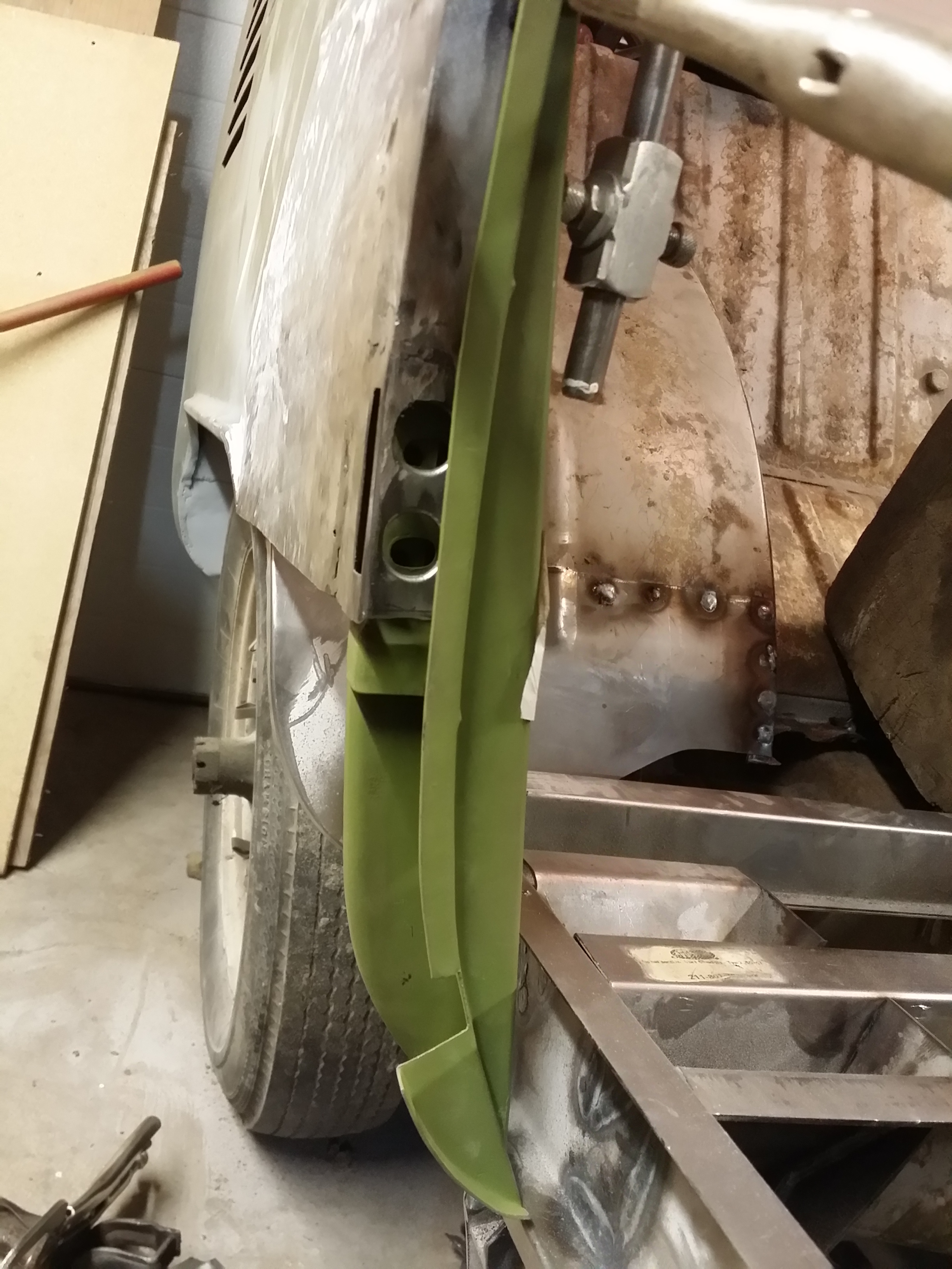 I figured I would start with the easy part I cut out the bad and made a cardboard template. Then cut the new piece and put a pressing in it and added the seat belt mount to the bottom