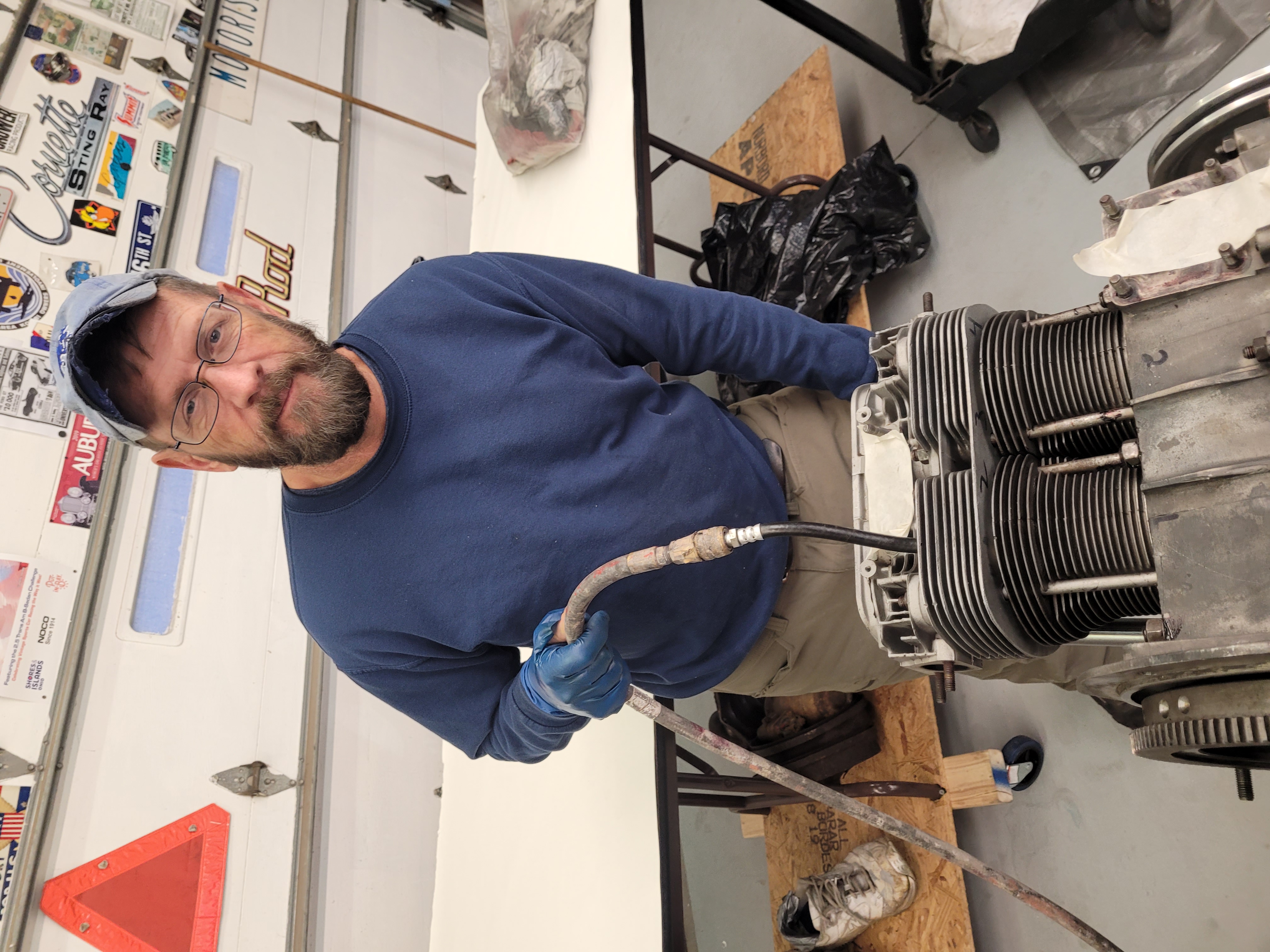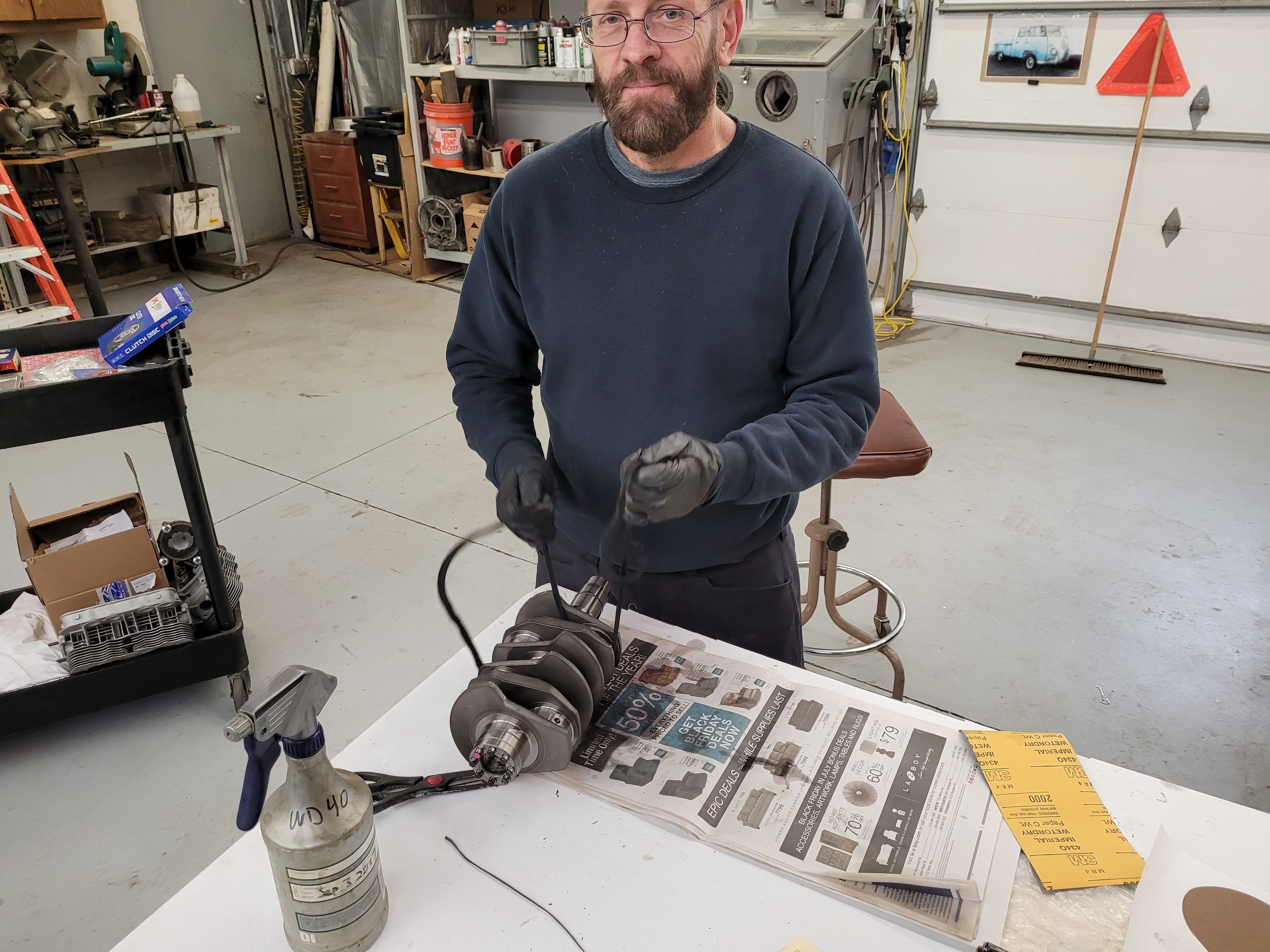 Rob's polishing the new crank with 2000 grit in the picture. We polish the cam journals, too, as I think that's what caused the premature cam bearing wear on my 2180. You can see and feel a difference after polishing with 2000. Rotating mass was balanced, too, and the pistons/rods are within a gram. (spec is 5 grams) Yes, I have a gram scale and it's for measuring parts, nothing else!