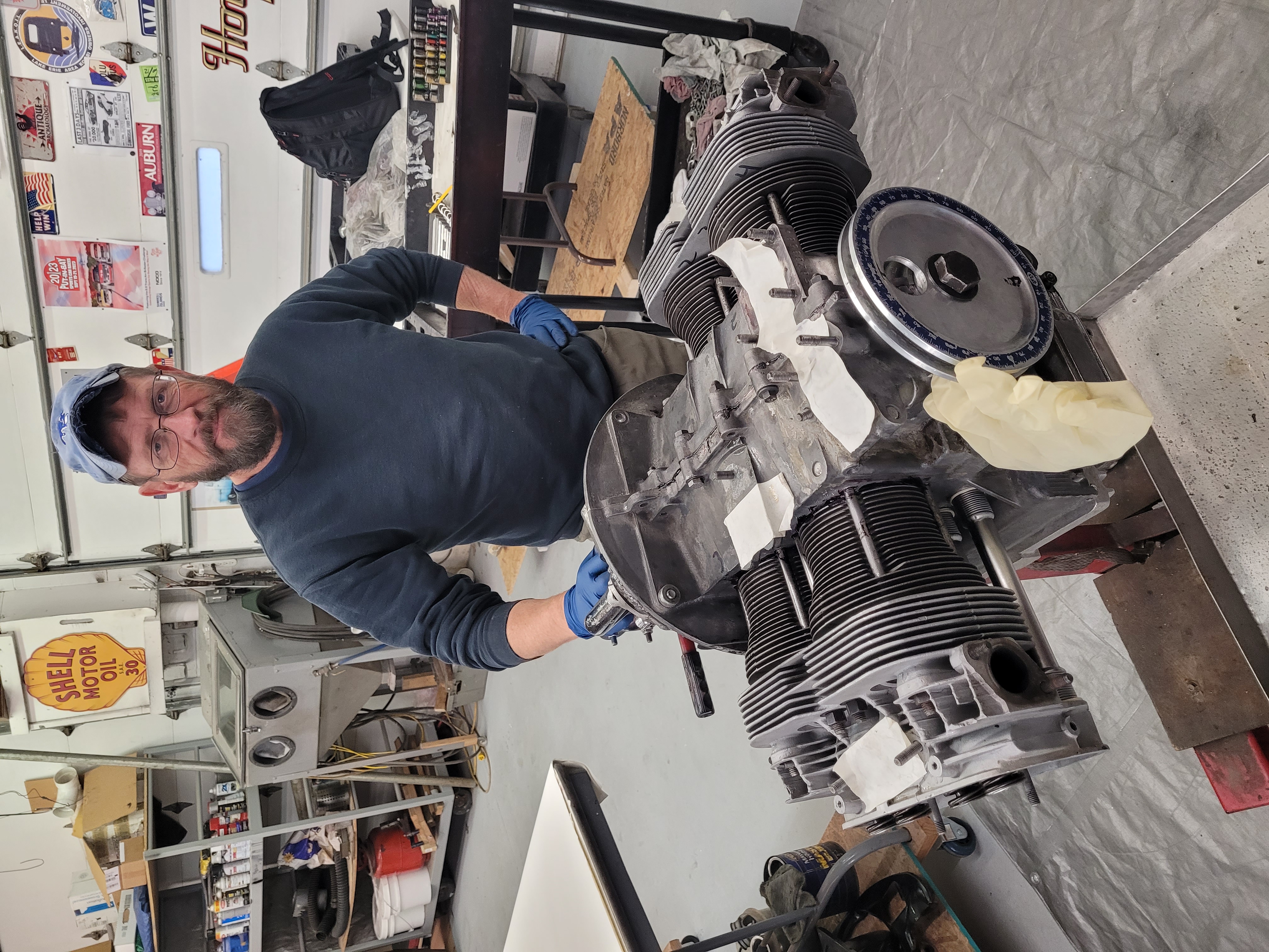 Rob's polishing the new crank with 2000 grit in the picture. We polish the cam journals, too, as I think that's what caused the premature cam bearing wear on my 2180. You can see and feel a difference after polishing with 2000. Rotating mass was balanced, too, and the pistons/rods are within a gram. (spec is 5 grams) Yes, I have a gram scale and it's for measuring parts, nothing else!