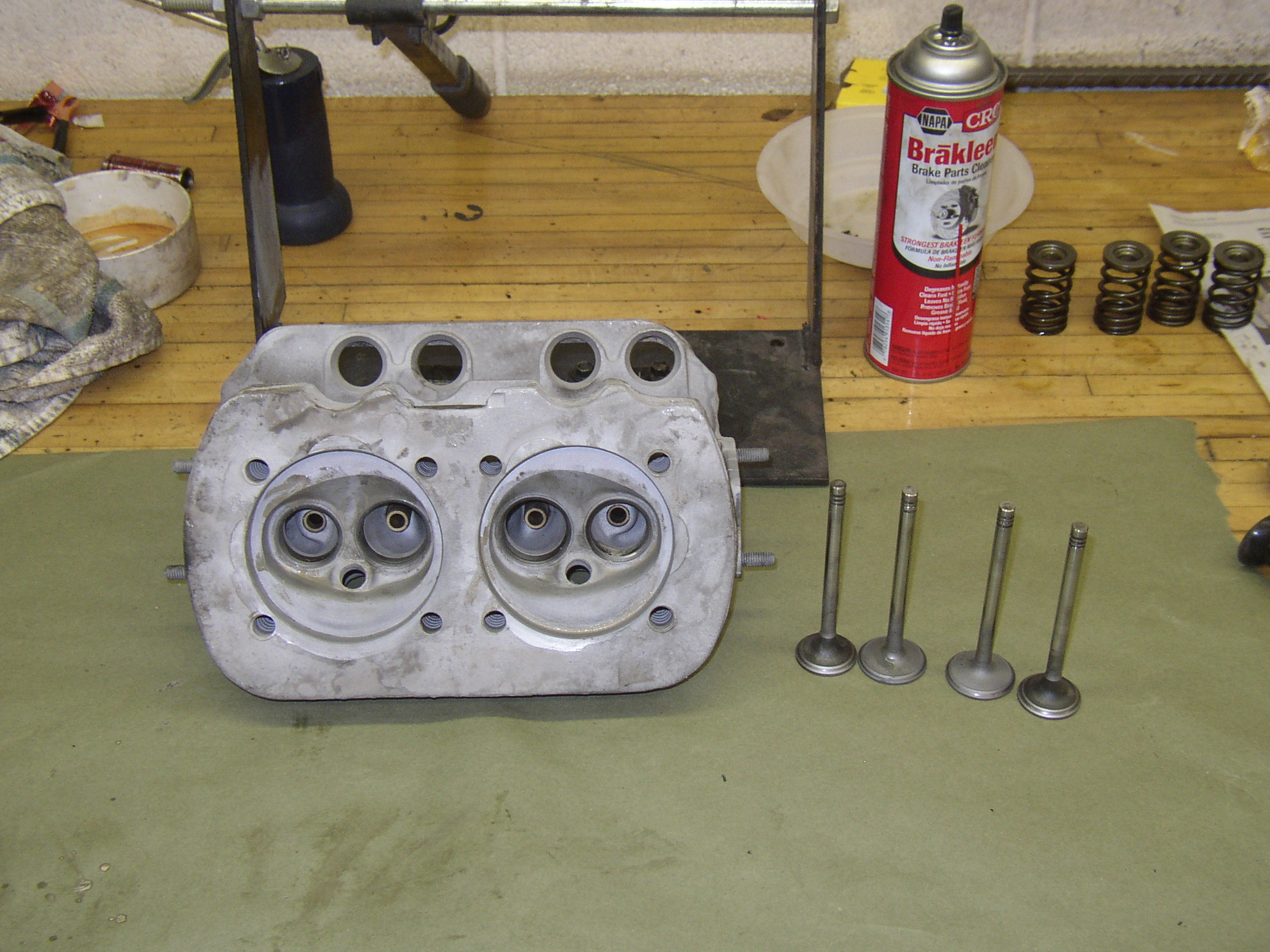 Here's the short block done, it spins freely with zero effort. I've been drilling an extra drain hole in the case to relieve pressure on the rear seal, the hole should be at 6 o'clock and the Germans put it at 8 o'clock for some reason. This leaves an ounce of oil against the lip of the seal when the car is parked and sometimes ends up on the driveway. The heads had less than 1000 miles since last ground, I disassembled them..... And blasted everything. I don't like the "valve grinding compounds" sold lately for lapping as they're too coarse and make little grooves in the valve face and seat, it's like sand in a paste carrier. I tried using rubbing compound this time and it worked great. (you can see a bit of it in the tub in the left background) I used a power drill running really slow and reversed directions a lot, maybe 2-3 seconds at a time and refreshed the compound. Parts done and ready to assemble, German jugs ball honed and checked, no wear or out-of-round measurable. Pistons soda blasted and re-ringed. Heads assembled and ready to go. I always air check heads as soon as they go on to make sure everything is air tight. The compound must have worked well as there was not a bit of leakage. Long block done. Oil system complete and priming, I was able to get 40psi cranking. Note the spark plugs and rocker shafts are off to relieve pressure, the engine spins very free like this to build oil pressure. You can see the "4" written on top of the piston and the notches in each jug to match- 4 notches on #4 jug, 3 on 3. I only use engine oil as an assembly lube, no fancy greases or assembly lubes. Runs perfect and great oil pressure, I use a really thin oil initially on the stand (like 0w-20) while the rings seat in for a few hours and then change to 0w-40 Mobil 1. I'm not finishing the sheet metal trim on this engine because I don't know what it's going into, that's why there's VGs on the heat riser pipes.