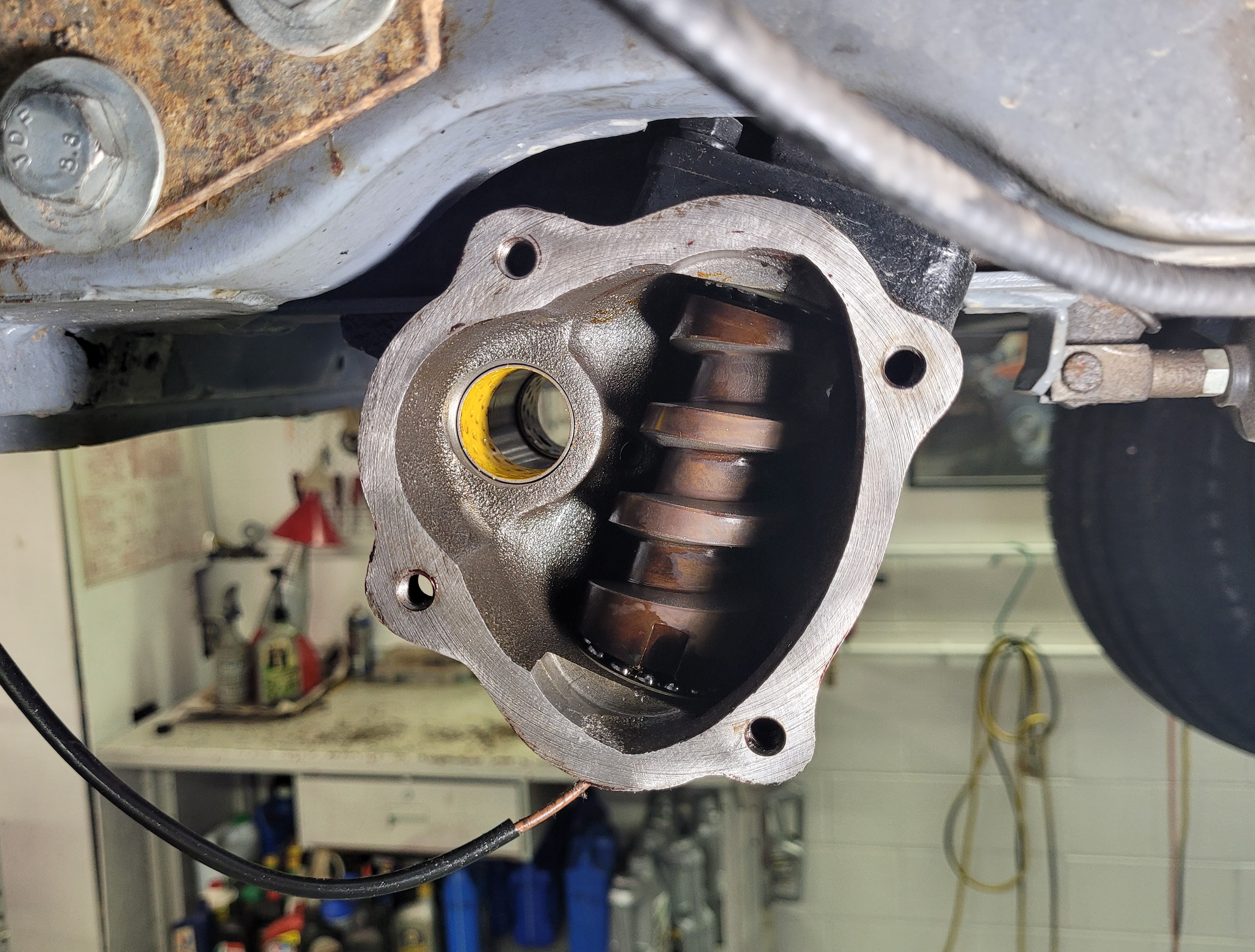 The pitman shaft bushings were worn so I replaced those, it can be done with the column in the bus. Pretty simple, actually, knock out the old bushings and knock in the new ones, ream them with an adjustable reamer, and install a new seal. You'd think it should be metric but the shaft diameter is .998". (There are two different boxes, this one is ATE/Ross) I used grade 00 grease from TSC for lube, it comes in a gear oil bottle. It's much thicker than gear oil but thinner than chassis grease and made for corn heads and other farm equipment. The yellow bushings are the new ones. No gasket on the cover, just sealer like an engine case.