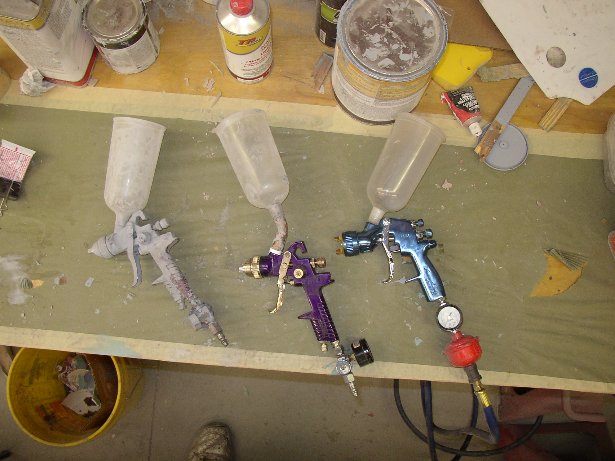 My arsenal- cheapie HF primer gun, another HF with a homemade 45* adapter for shooting inverted surfaces, and a DeVilbiss Finish Line gun. Not top shelf, but good.