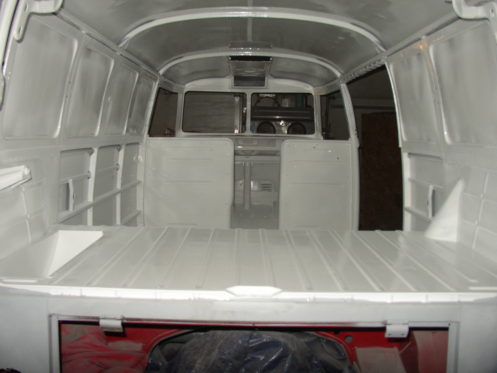 Finally got some time dedicated to the bus and got a lot done but not without a big hitch. Monday I finished prepping the interior with dabs of mud, weld and etc to fix all of those little things that show up in primer. I masked the bus and left the heat on warm all night so I could shoot yesterday on warm metal. I went in early (10 is early for me) looking forward to shooting the PPG DelFleet paint I bought a couple of months ago. I usually use the cheap stuff (Kirker) which I've had good luck with for decades but this time I was talked into the good stuff by a local authority (to be named later). I read the instruction sheet again and mixed the paint using a digital scale to exact gram measurements. The surface temp was 75ish with an IR gun when I started and shit went wrong from there in a big way. I was having no luck at all with this paint- thin, ran, wouldn't cover, wouldn't set up, I meant this shit was bad. It was like shooting milk from a spray gun. I called Chuck with a 'WTF am I doing wrong' tone of voice, he came right out and arrived at the conclusion I got a bad can of paint. Luckily I had 1.5 gallons of white Kirker in the cabinet, so I switched to that and had much better luck. All in all, a good day in the long run.