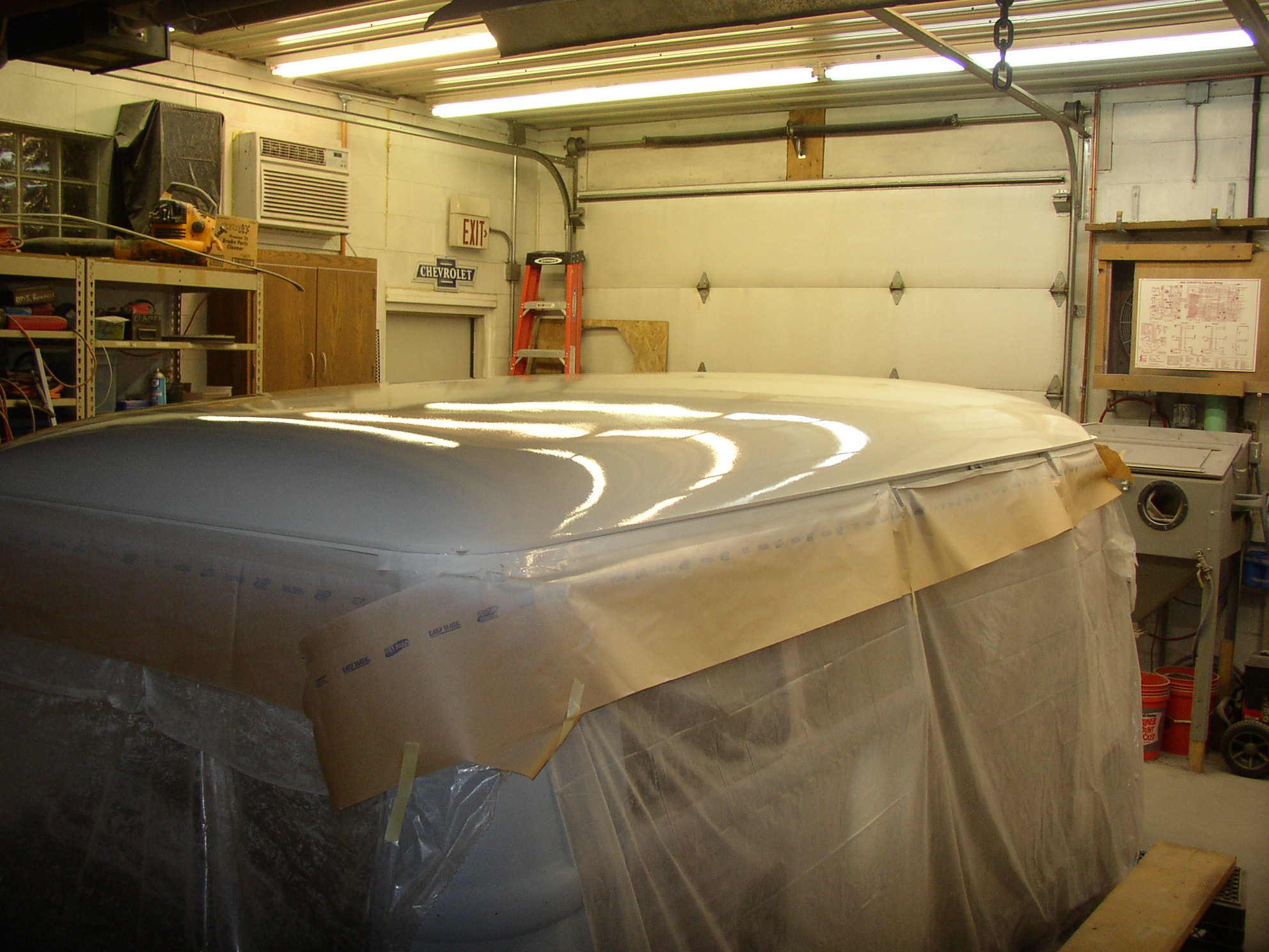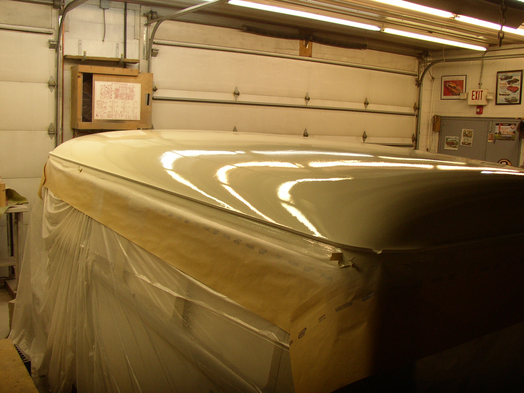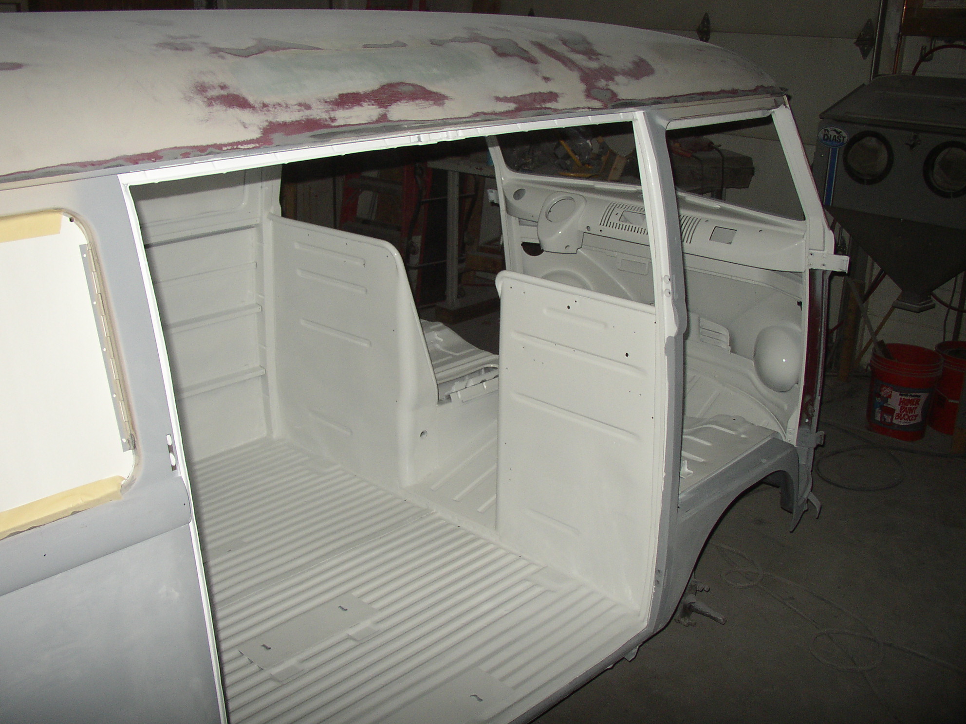 The idea is to shoot the inside of the roof with the 45* gun, then switch to the DeVilbiss gun and shoot the insides. Then pull the tarps and shoot the floor before finally unmasking the dashboard (to protect it from overspray and drips) and shoot it last. I also shot the white parts of the jambs so they will blend easier when shooting the exterior. I also did the funny "eyebrow" area over the windshields where the screens are as this will be tough later on.