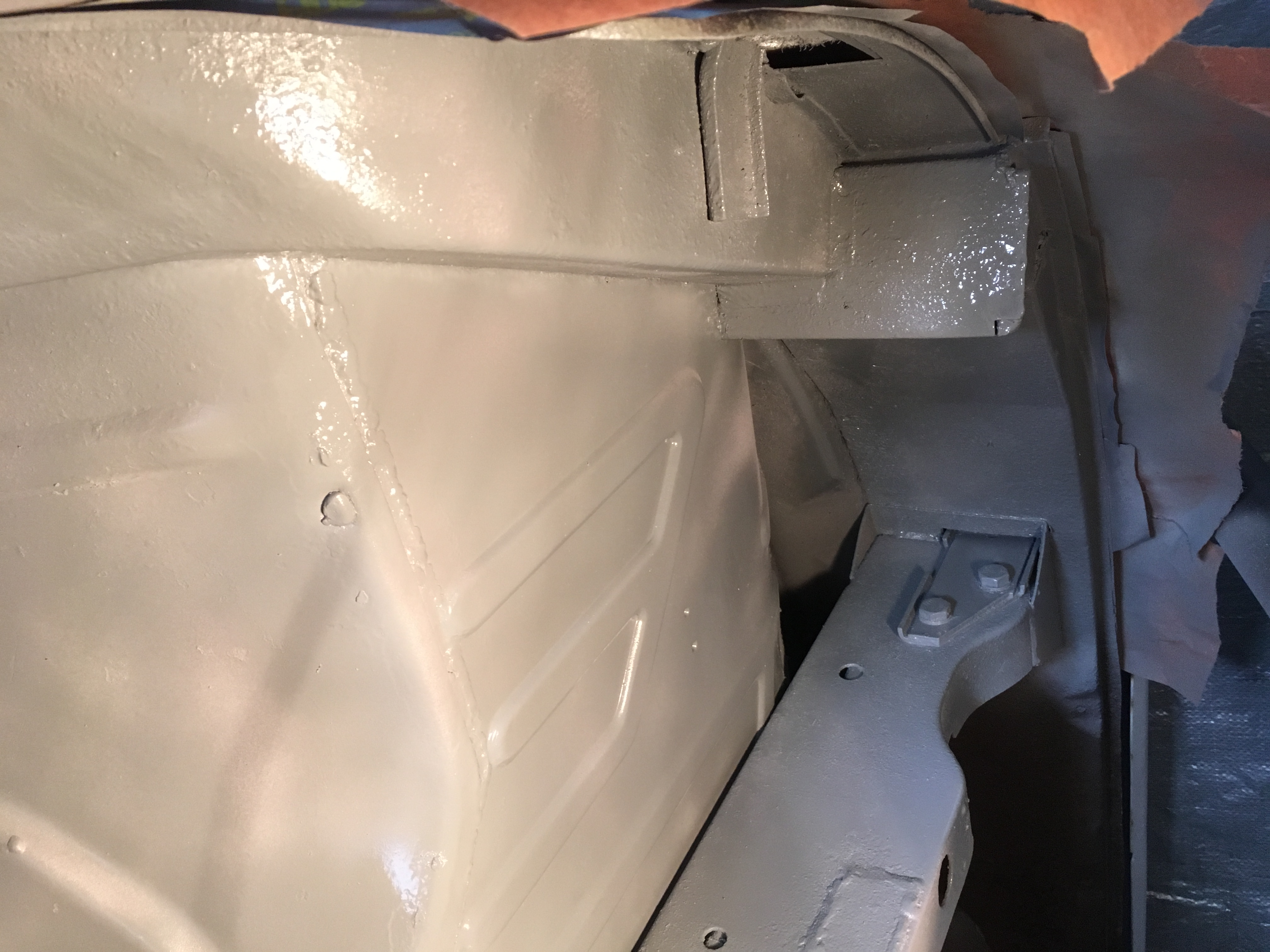 I finished getting the wheel wells painted and decided to do under the front nose as well. The underside of the nose was very solid. Some surface rust was about all I saw. I used the same process and just finished putting the final coat on this AM.