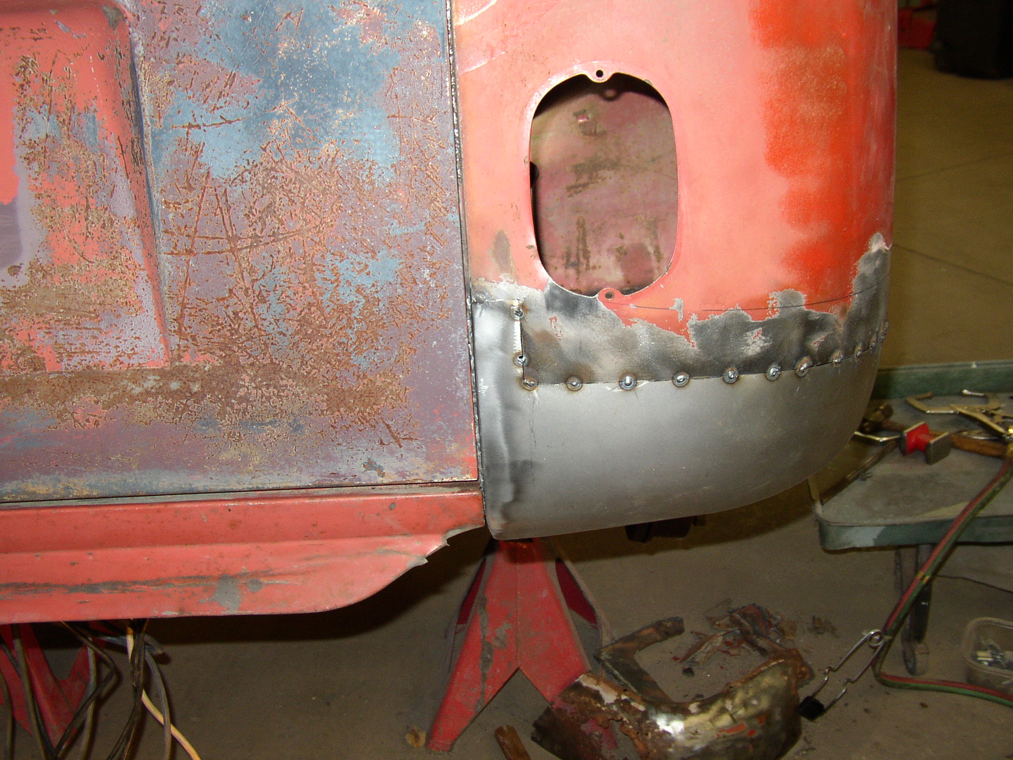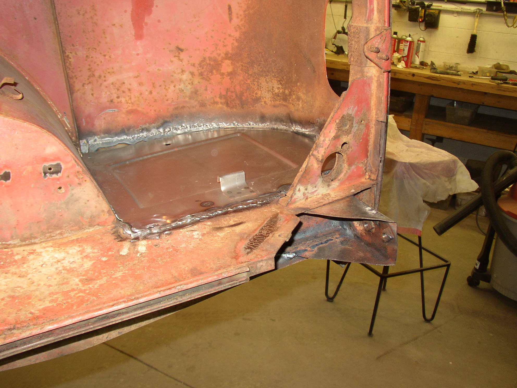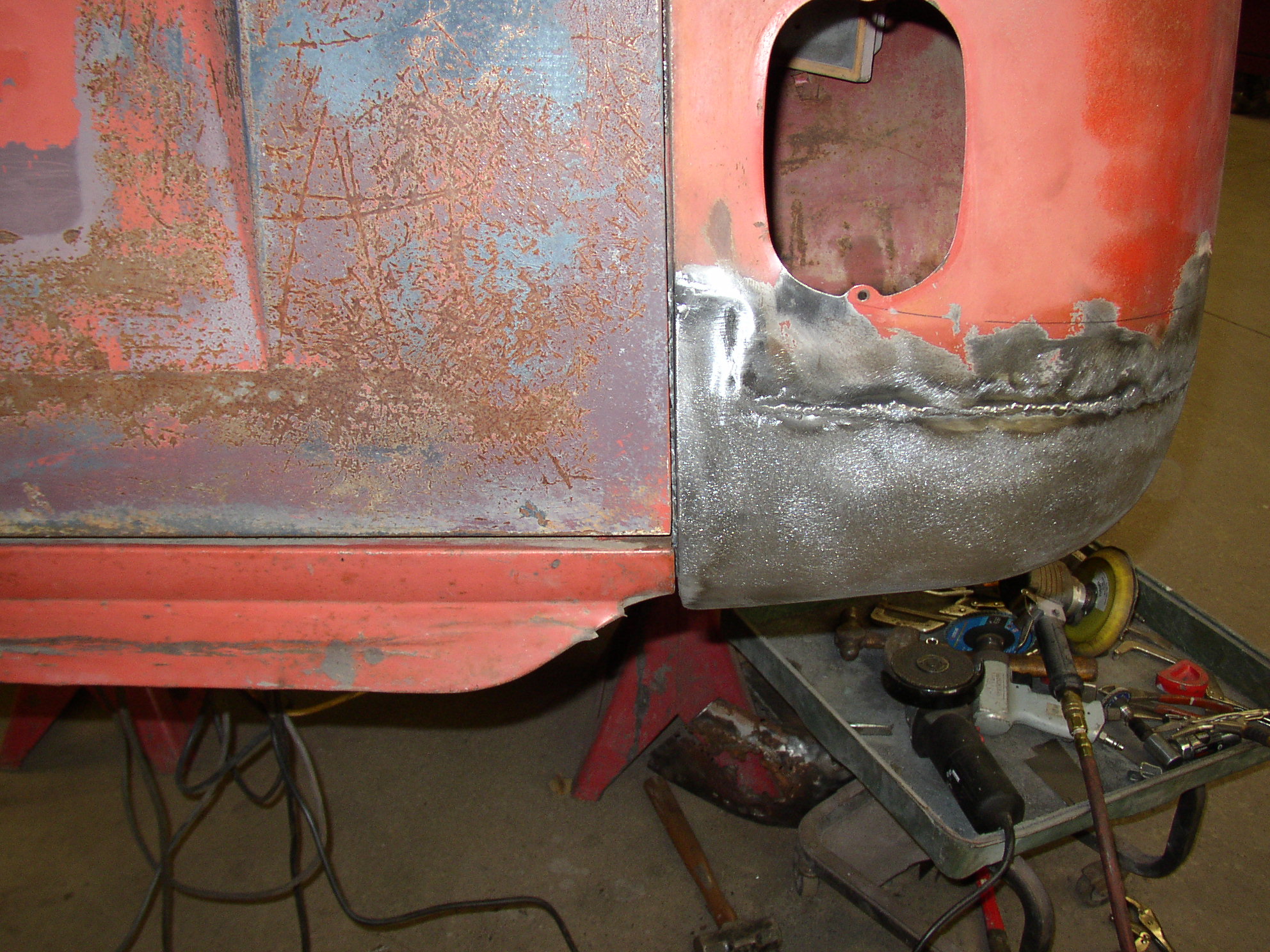 Sheetmetal is the worst thing to weld anyway so getting a high quality welder was a big step up, years ago I had a Snap-On YA212 mig which was great then, but when I sold the shop all equipment went with it. Now I find myself buying all the shop equipment I sold with the business. :|  The important things to remember with sheetmetal is patience and really short welds. The metal (both new and old) I’m welding is about .031”. If you weld for more than ¾ of a second in one tack the metal just falls away and leaves a big F’ing hole which you must now fill in. Also on long straight welds like replacing a body panel you must wait between each 3/8” long weld for the metal to cool completely off, otherwise your nice flat panel turns into a potato chip. I also stepped up to a nice Miller Digital Infinity helmet with a big window which is nice. I cheaped out and didn’t spend the extra $10 for cool graphics.  :roll: