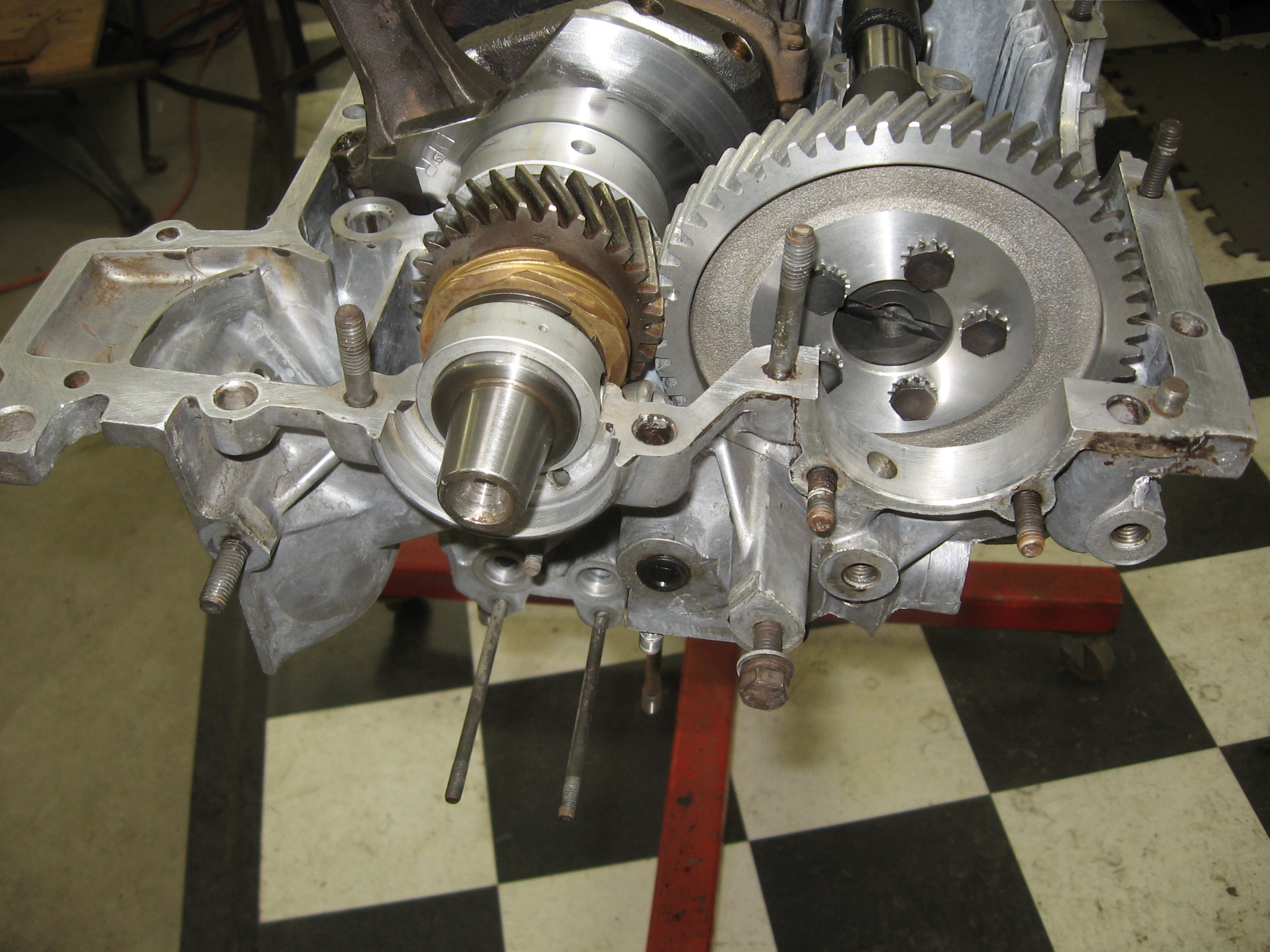 Just a note here. ALL replacement cams come with bolt on gears. Most all replacement oil pumps will have clearance issues with the cam bolts and the pump. Note the low profile heads on the cam bolts. If you do not check this clearance,THIS WILL HAPPEN. Now we are ready to stick the case halves together in the next installment
