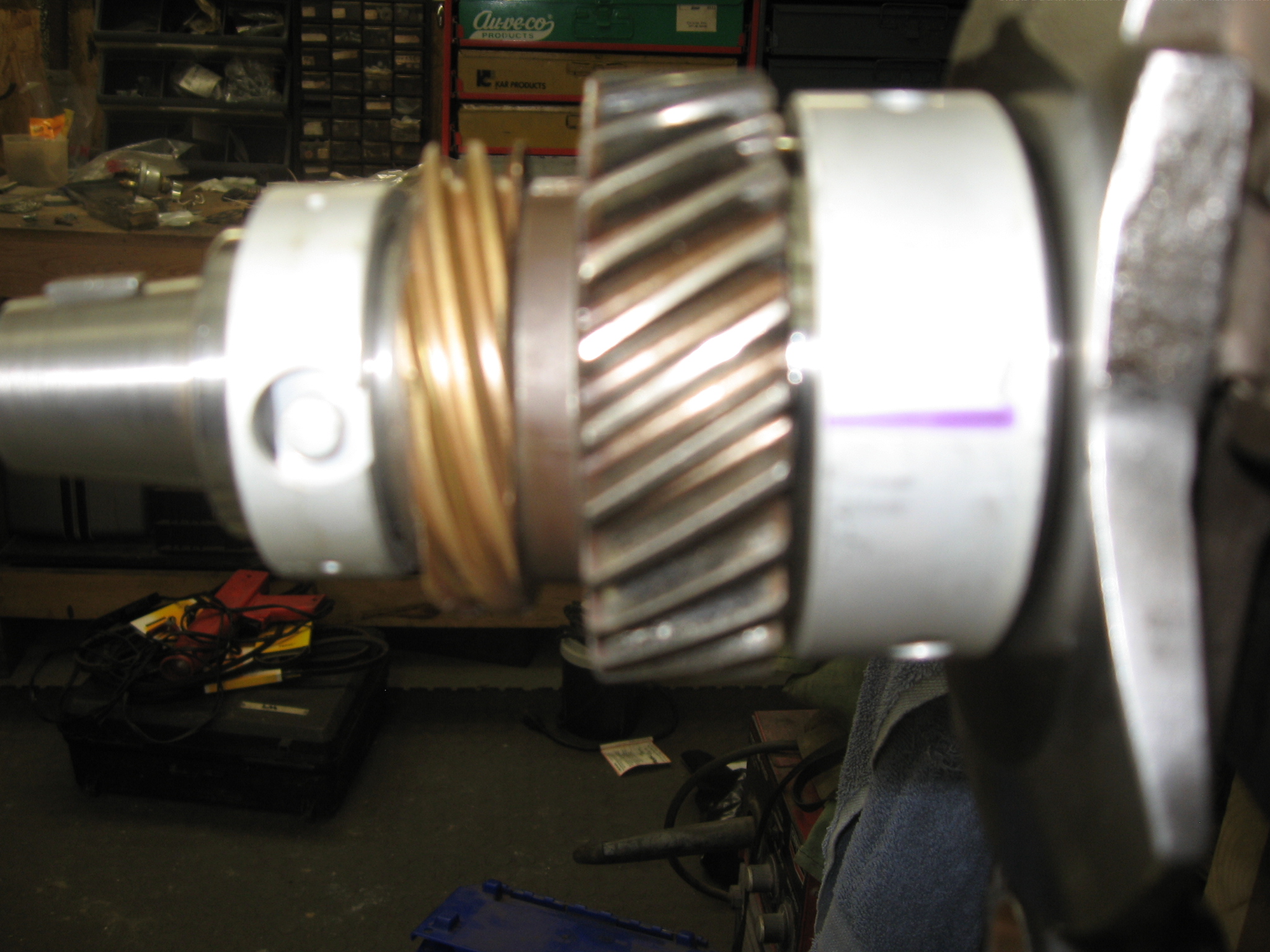 Now install the pistons in the cylinders. I did not get a pic of this,but,using a ring compressor install the piston from the top and push it down until the pin bore is accessible. Prior to this, you need to stare at things and determine which piston/cylinder is going on which rod. There is an arrow on the top of the piston. This arrow MUST point towards the flywheel. You also need to determine which direction that the pin will install from. On the T4 engine #4 has to be installed first with the pin installed from the #3 side. (the oil cooler boss prevents the pin from being installed from the other direction). Stare at it awhile and have a sequence planned.