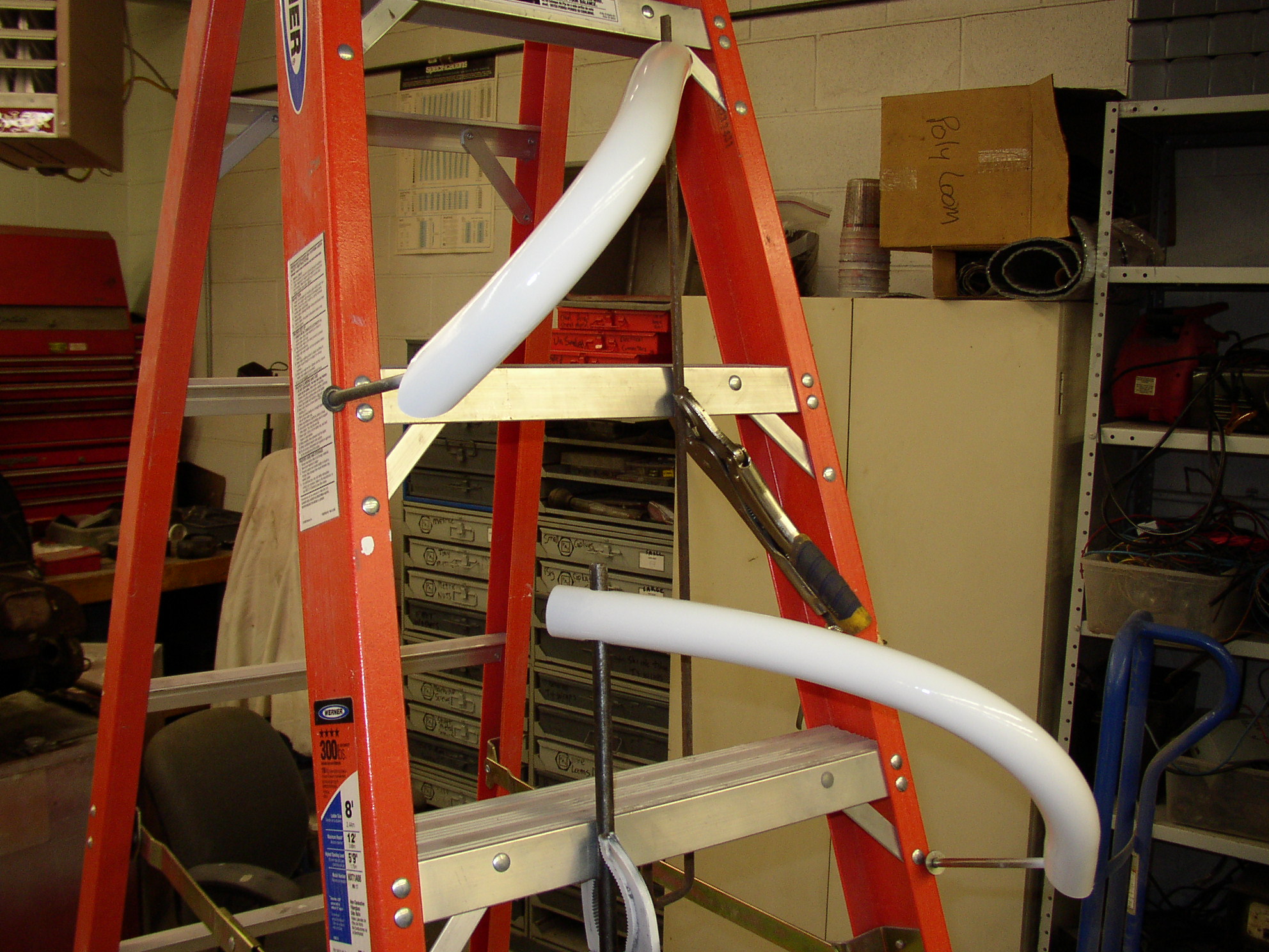 Beltline trim and the front bumper trim are done, it was tricky to process that stupid 10' long LR trim piece without hurting it or bumping the bus and scratching the paint. To buff it I had the small door open in the shop and it hung outside. I had a hangman setup rigged to hold the opposite end while I started screwing in on, while using a blanket and magnets to protect the paint on that end.
