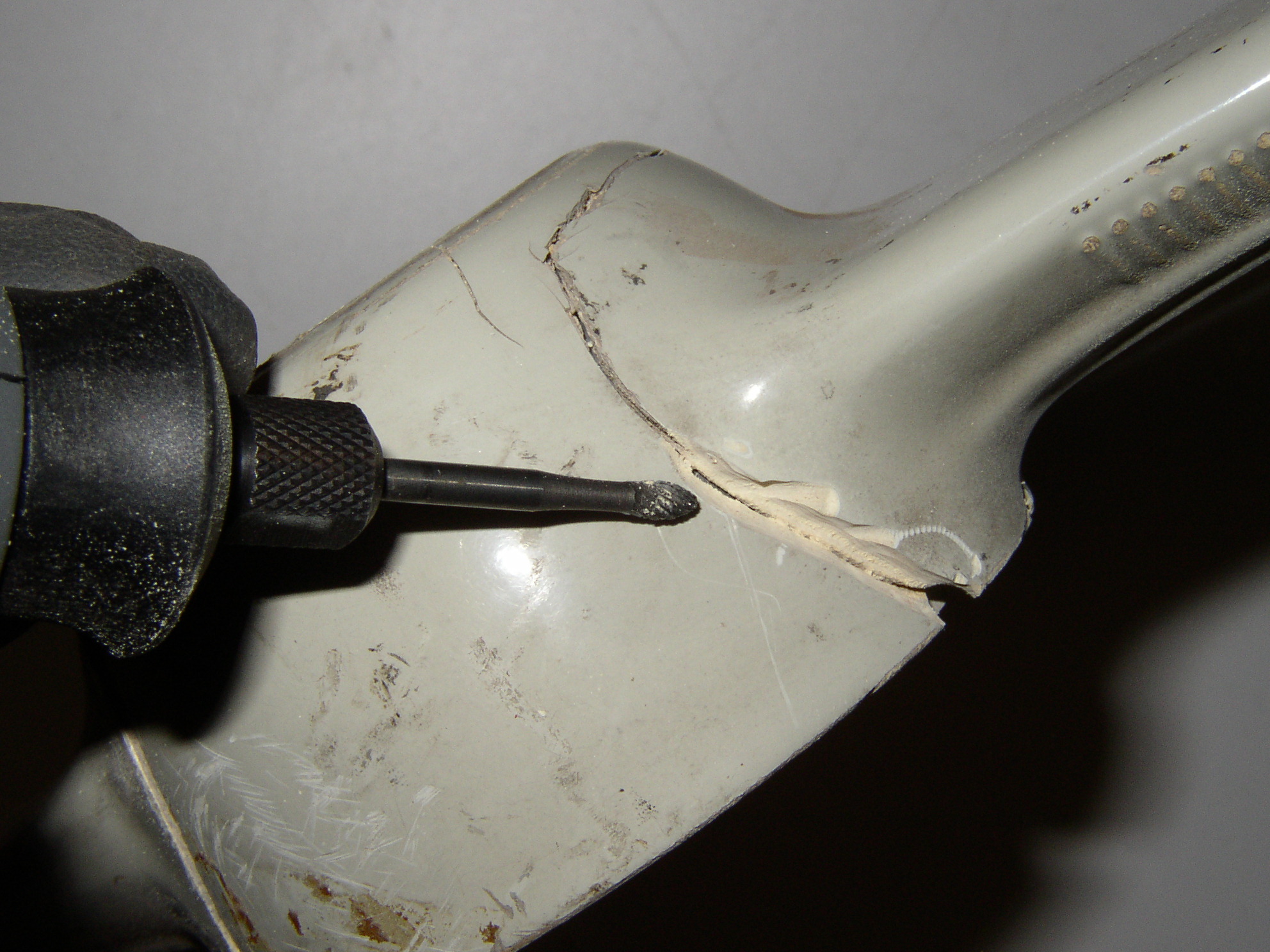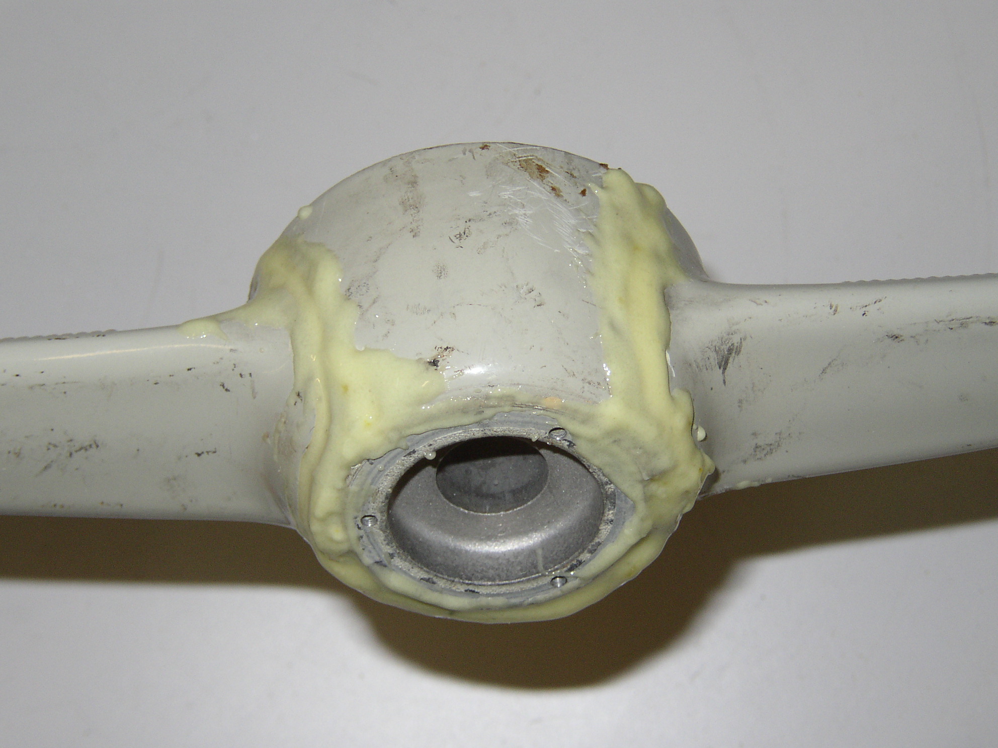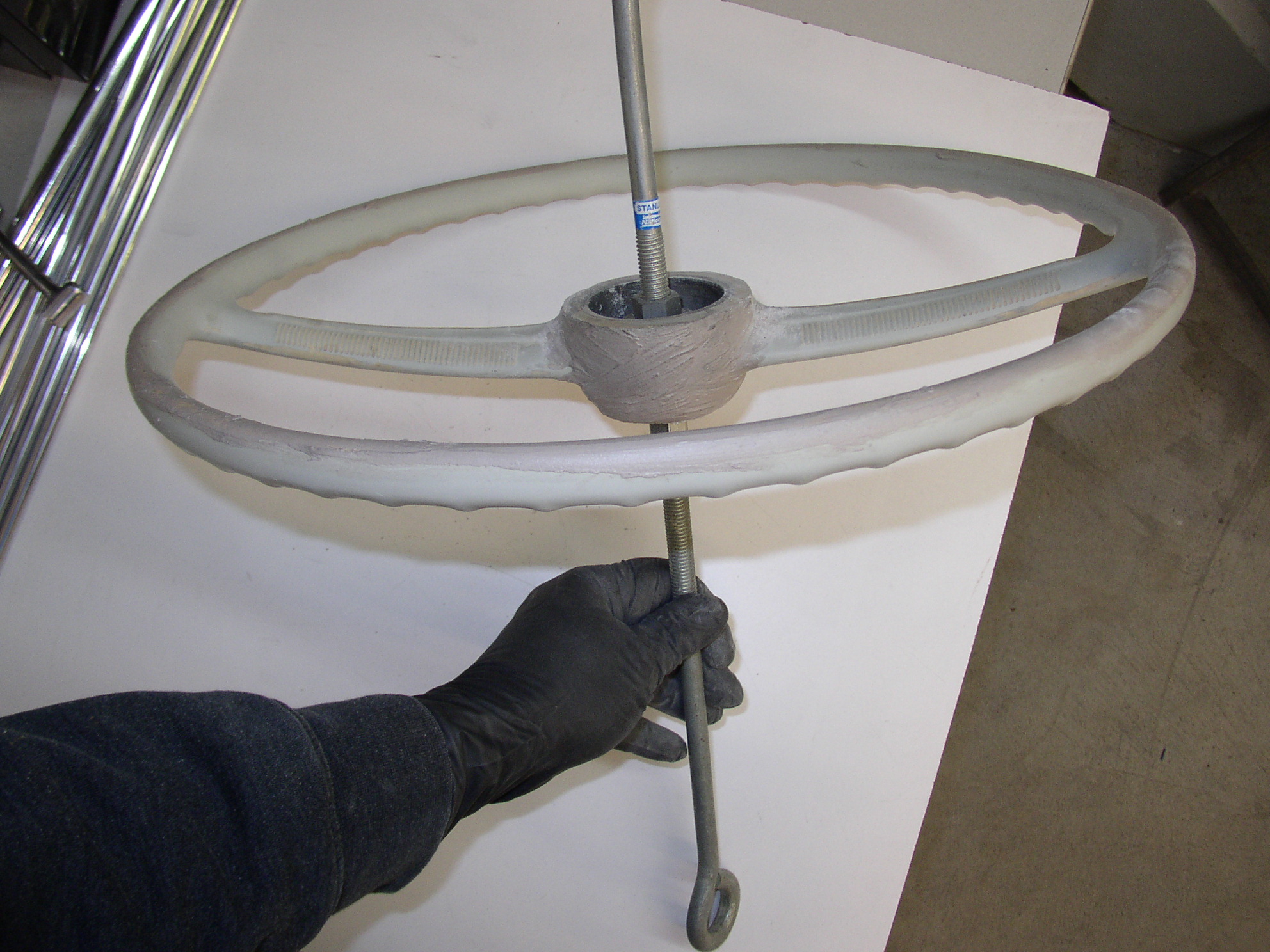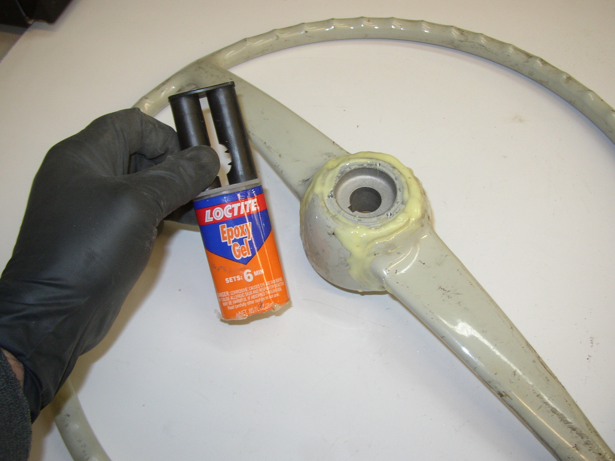 I saw a filthy, messed up steering wheel at Ypsi last year and picked it up, figuring I could use that on the bus while I restored mine. After I wiped it off with lacquer thinner I found it was in better shape than the one I had! I figured I'd do a hillbilly restoration.