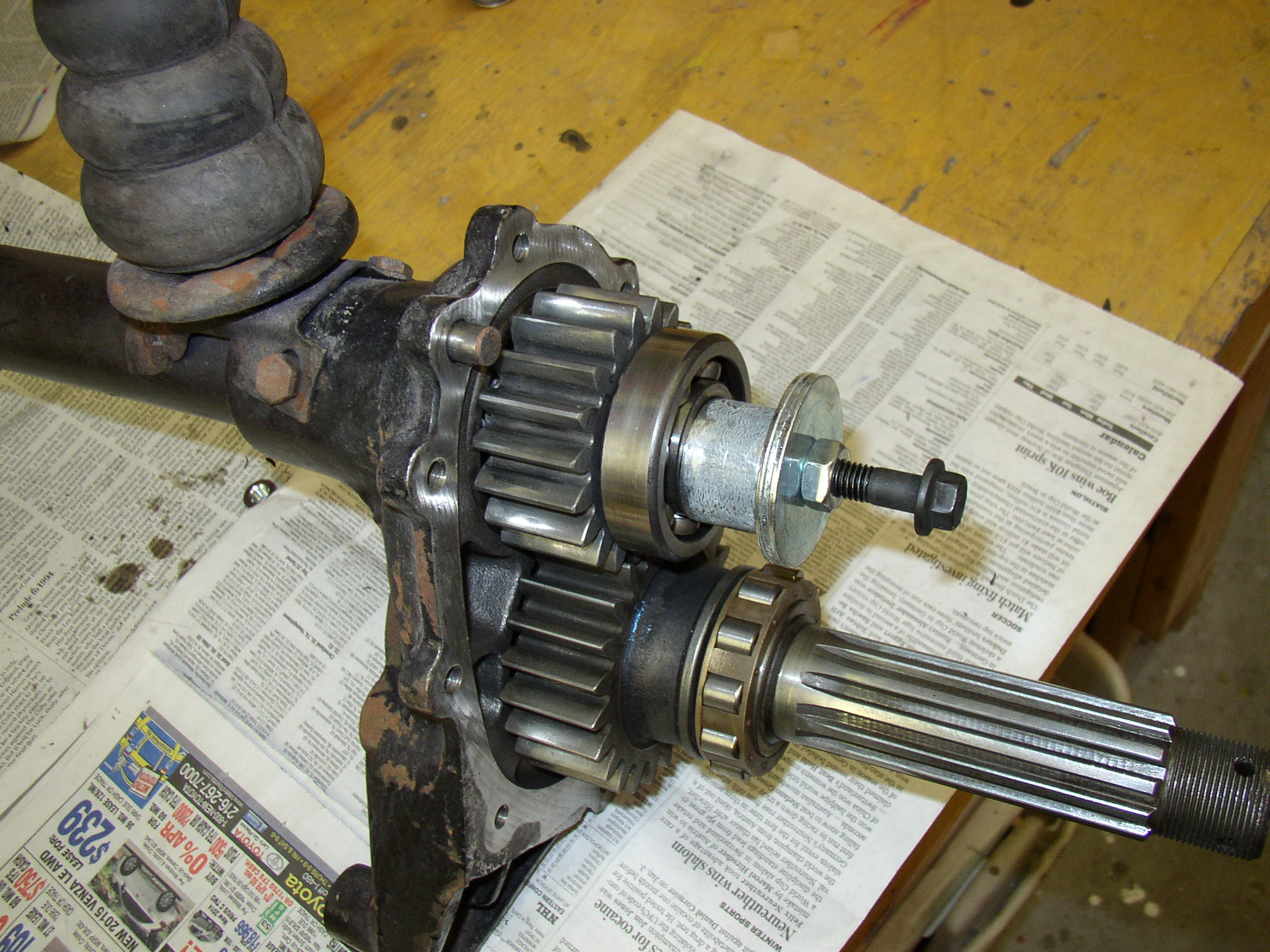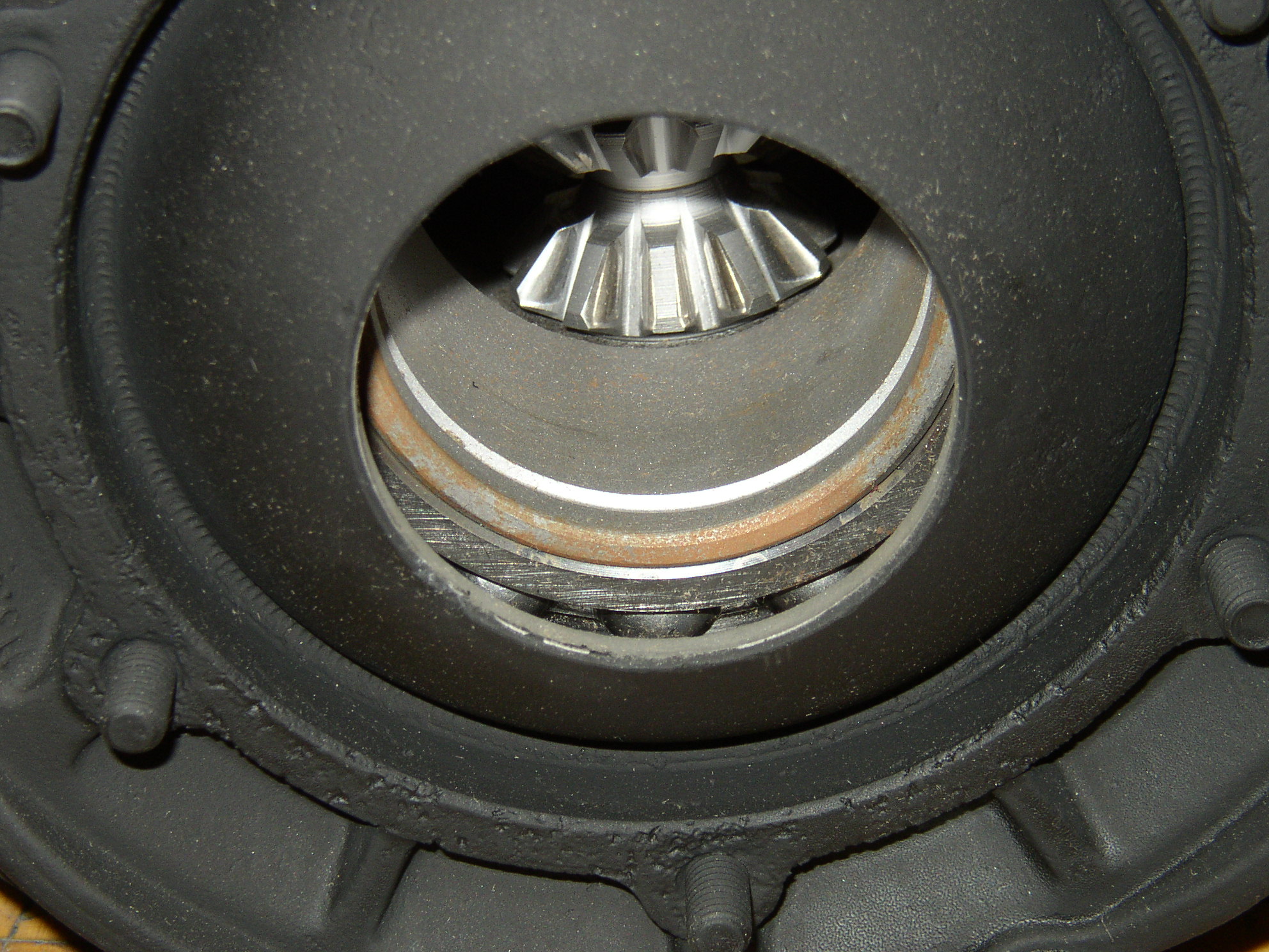 This was the other side- the frigging plastic shim/thrust bearing was missing in the trans! It should have made a clunk on turns and maybe shimmied or wandered going down the road but I never noticed it. The thrust shim is a spare I ended up using.