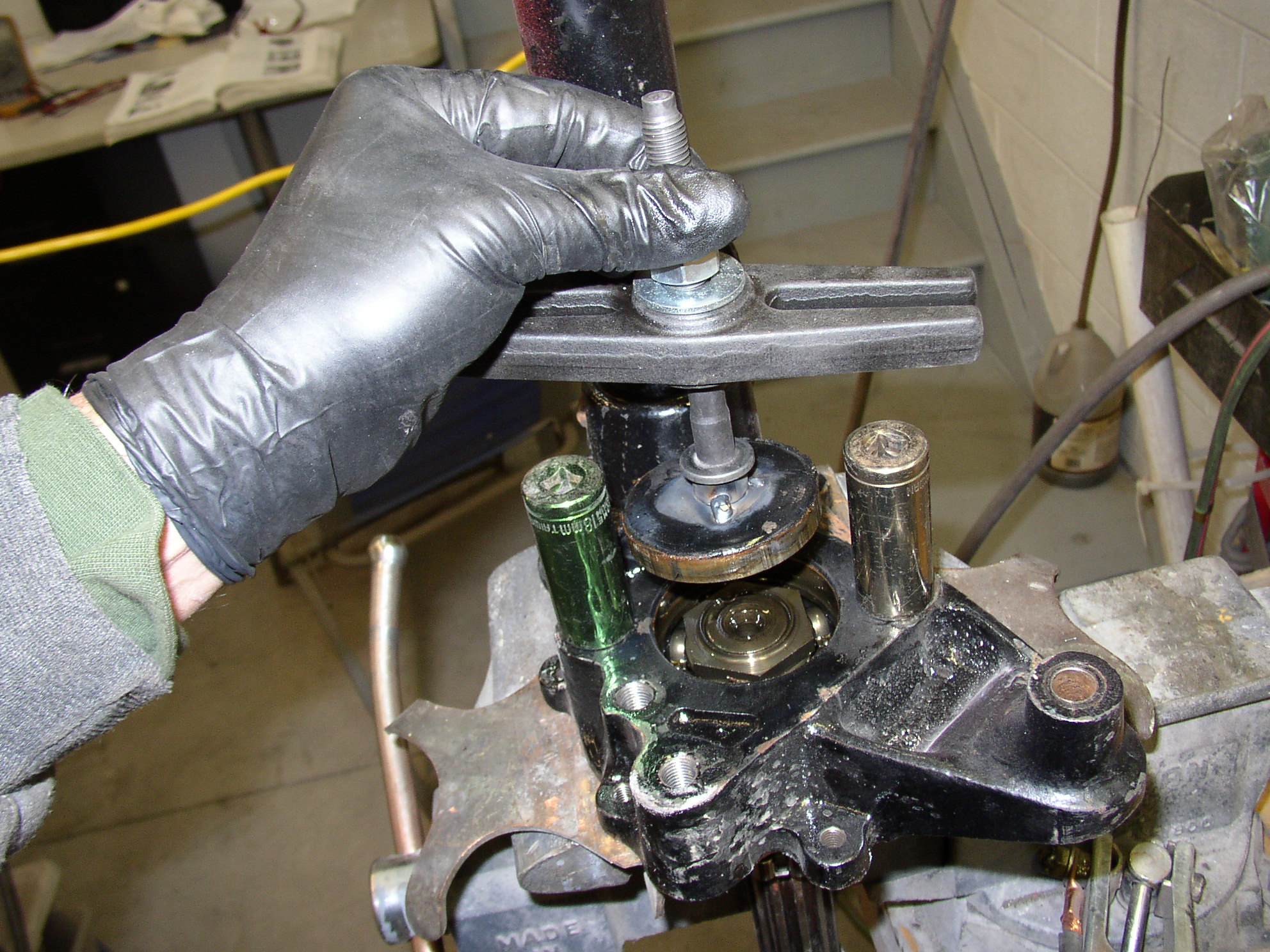 Then the outer axle bearing is press fit onto the axle, I set up a puller to get it off.