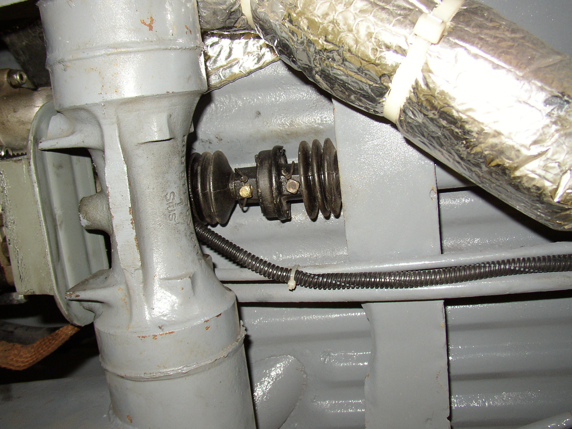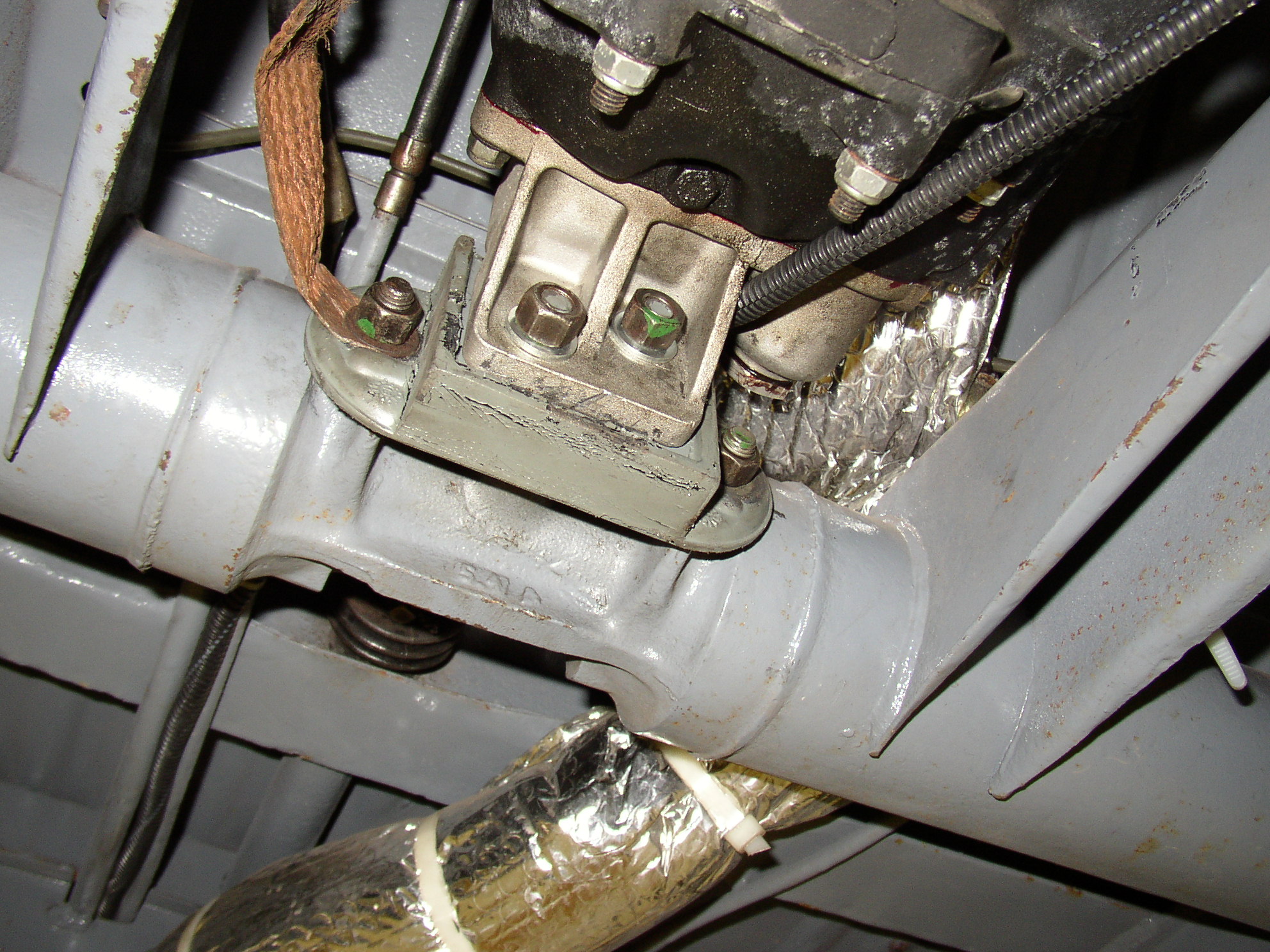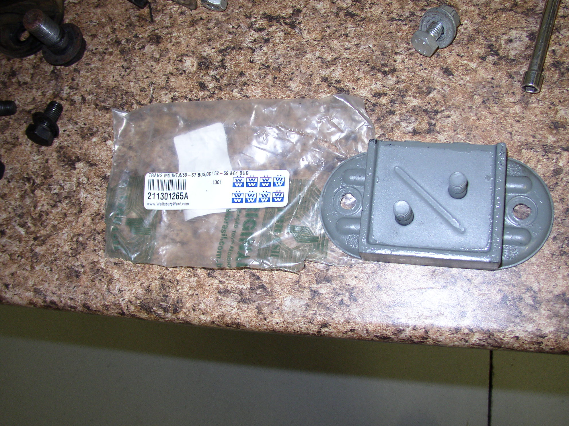 I used a couple of wooden wedges to bring the powertrain rearward so I had access to the trans mount. Remove the mount nuts. It's tight in there, tight enough that there's not enough room to get the mount out without removing the studs too. Luckily I had sandblasted and thread chased the stud holes so they came right out for clearance. Yep, it's broken, a WW mount I put in new 5 years and 11,000 miles ago. Fortunately I stock these, it happens to be a WW mount but it looks like WW changed their supplier. It no longer has their logo on the side and it's a gray one from Brazil. The Samba gang seems to think the gray ones are better.
