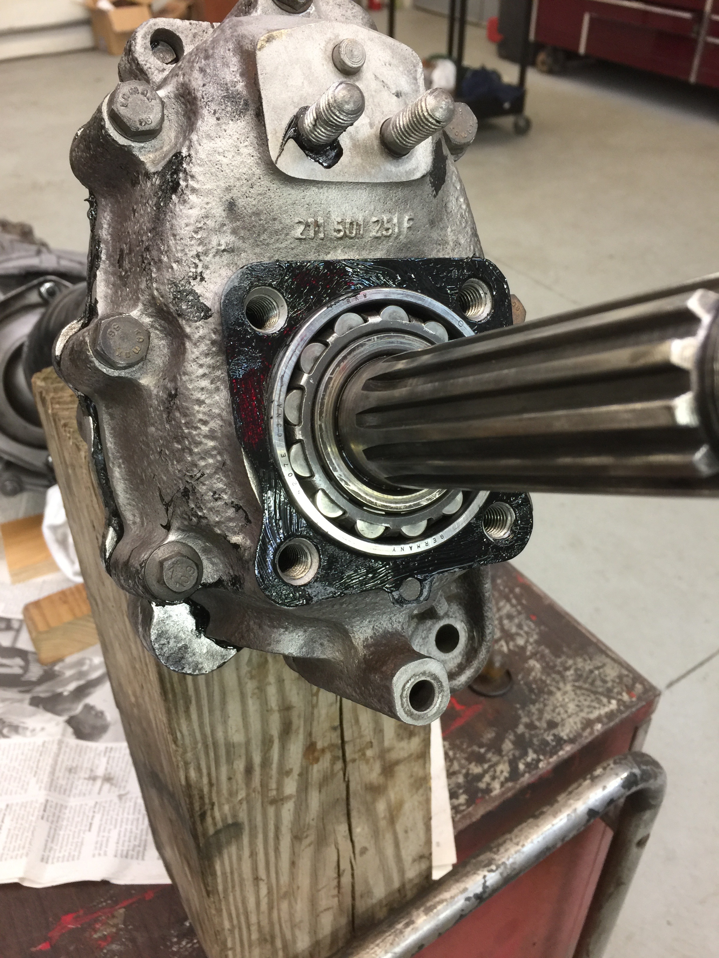 We had one issue with a bad outer axle bearing, but Bruce had a backup. Some of the other original bearings were bad, so Bruce swapped them out. Someone in a prior life really butchered one of the RGB housings (probably trying to get a freeze plug out) but Bruce cleaned it up. (You may see that prior damage in some photos)