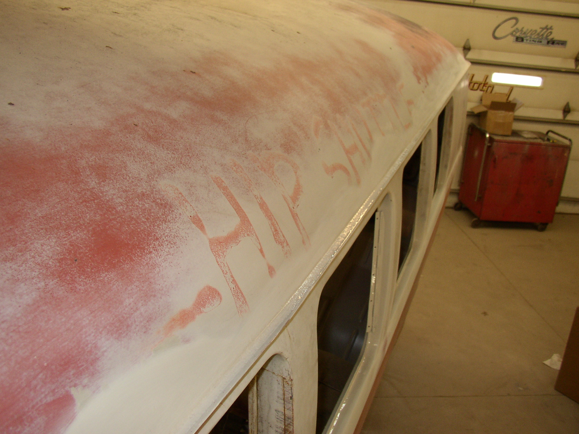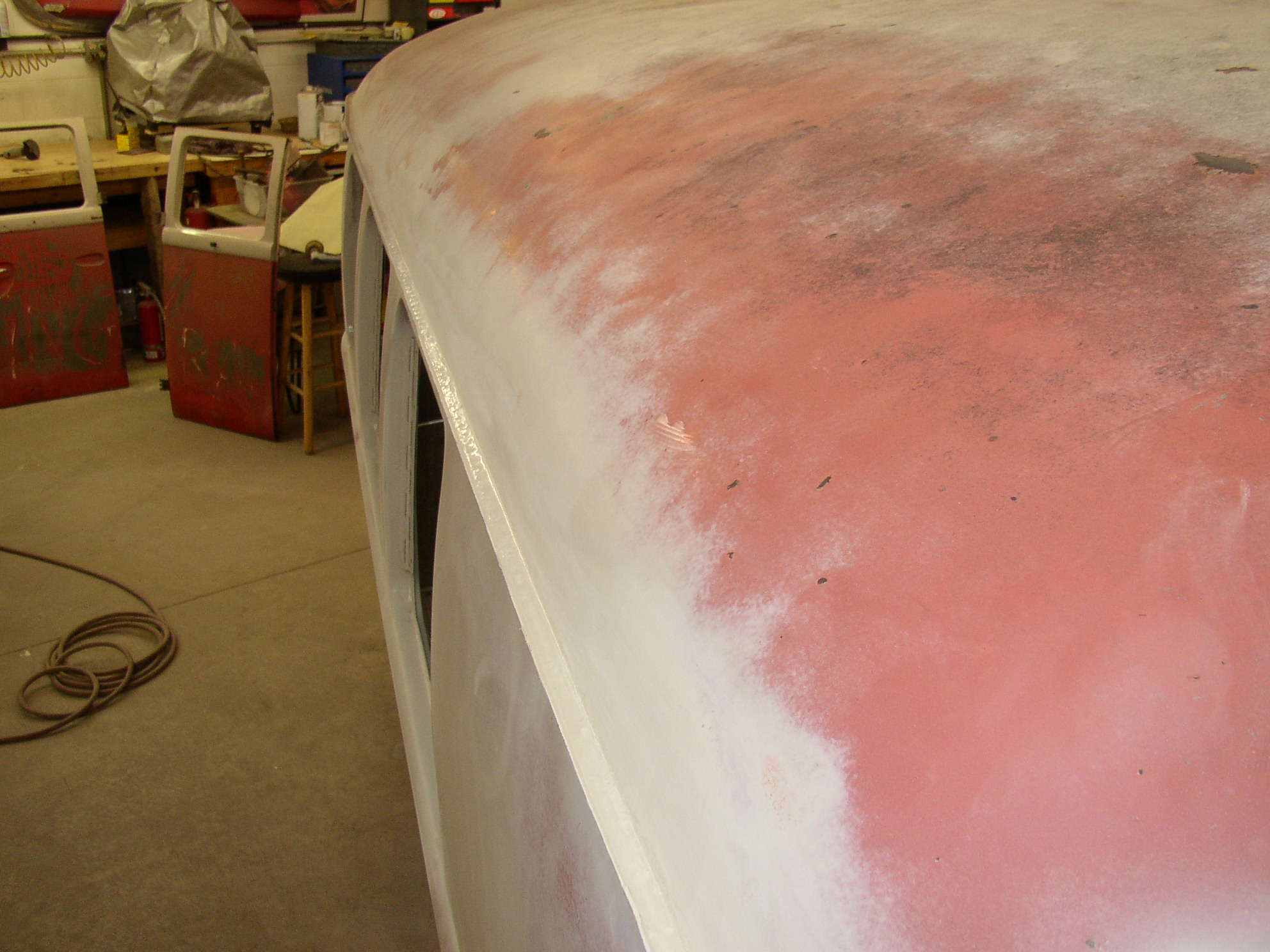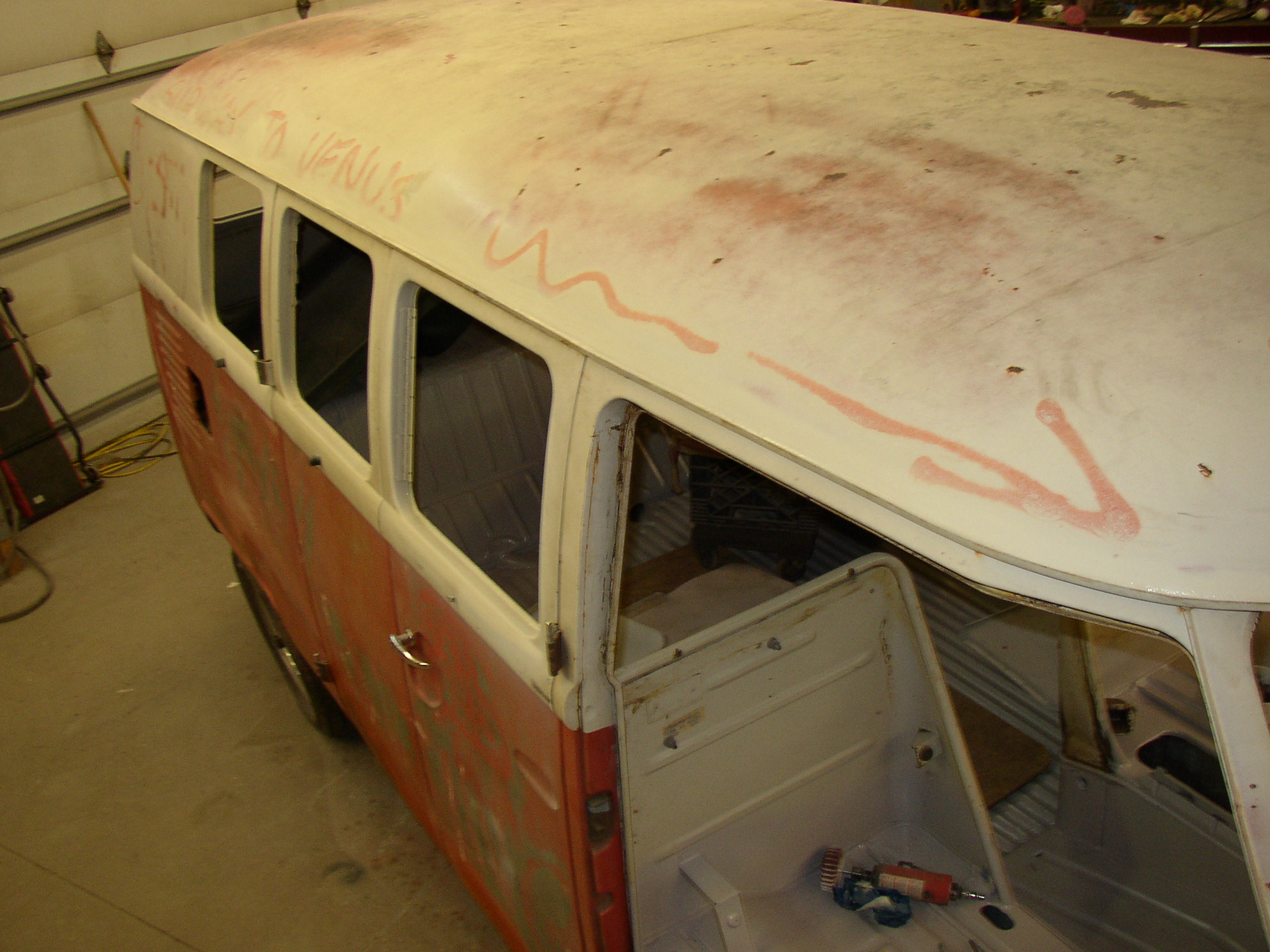 The decklid was a mess and I have a better one. I wanted to keep the one original to this bus but I didn't want to make a weeklong task of welding metal. It was only rotted in one place- just outboard of the glass area (not under the rubber, oddly enough) on the horizontal surface of the window ledge. Looking at it, I wonder if the Texas sun was reflecting off the glass at the right time of day and baking that particular area. The bottom of the decklid is beautiful, but just outboard of the glass it was severely pinholed. I took the shortcut route- sandblast it really well, epoxy up the pinholes, (Swiss cheese), and prep/paint. It actually came out much better than I anticipated. I tried (unsuccessfully) to remove some of the graffiti. I ended up removing as much OE paint as spray can. :roll:
