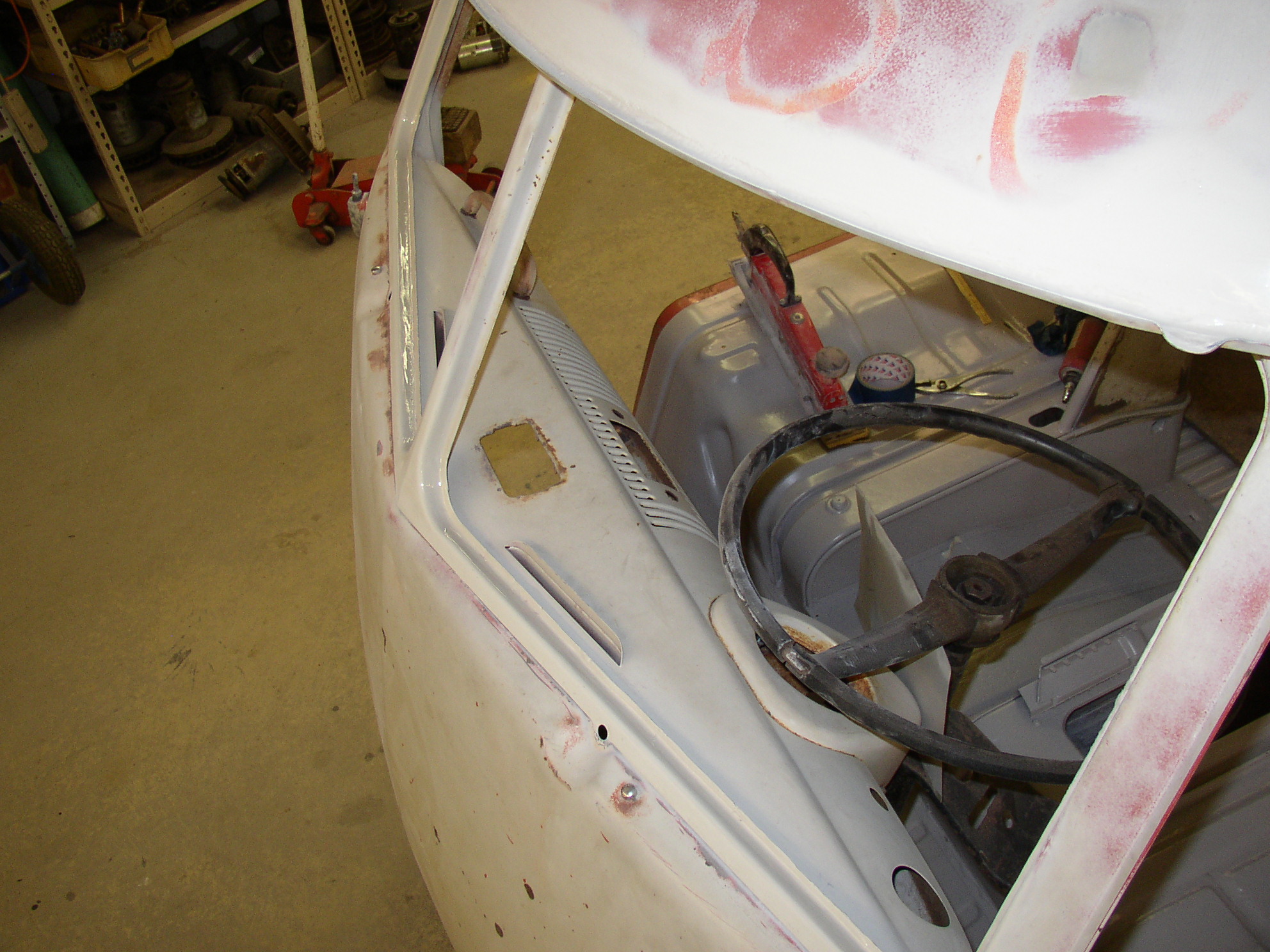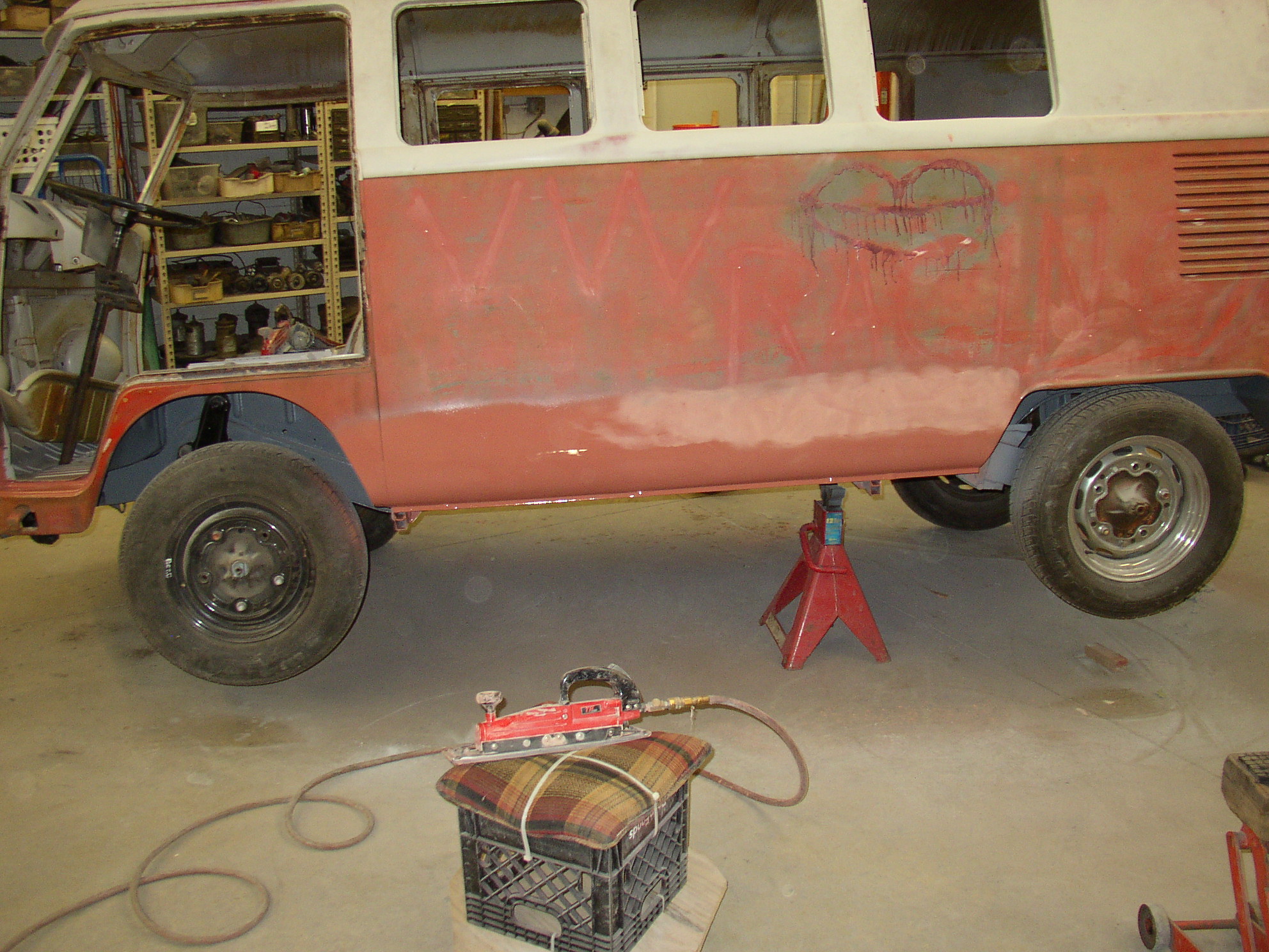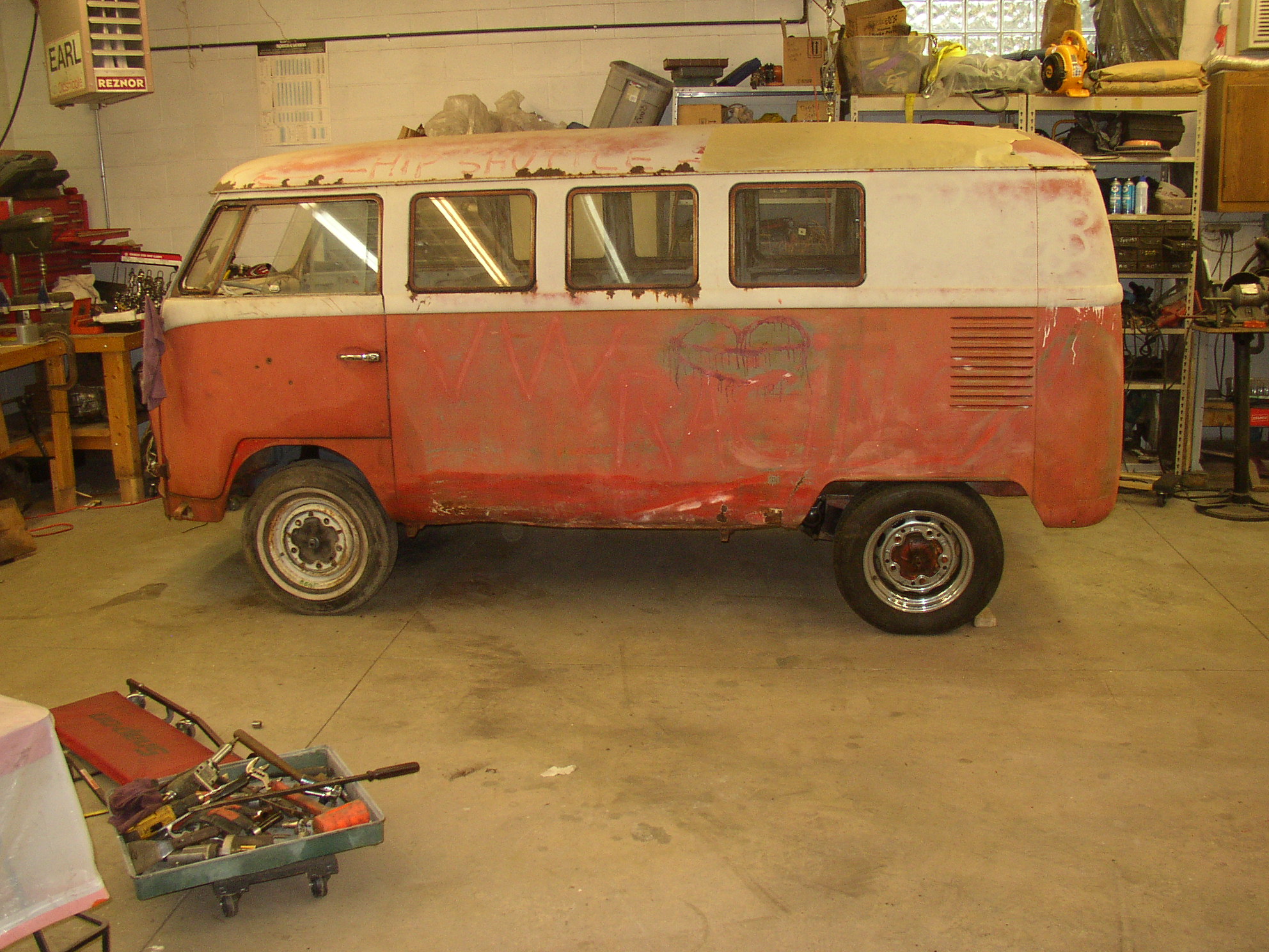The decklid was a mess and I have a better one. I wanted to keep the one original to this bus but I didn't want to make a weeklong task of welding metal. It was only rotted in one place- just outboard of the glass area (not under the rubber, oddly enough) on the horizontal surface of the window ledge. Looking at it, I wonder if the Texas sun was reflecting off the glass at the right time of day and baking that particular area. The bottom of the decklid is beautiful, but just outboard of the glass it was severely pinholed. I took the shortcut route- sandblast it really well, epoxy up the pinholes, (Swiss cheese), and prep/paint. It actually came out much better than I anticipated. I tried (unsuccessfully) to remove some of the graffiti. I ended up removing as much OE paint as spray can. :roll: