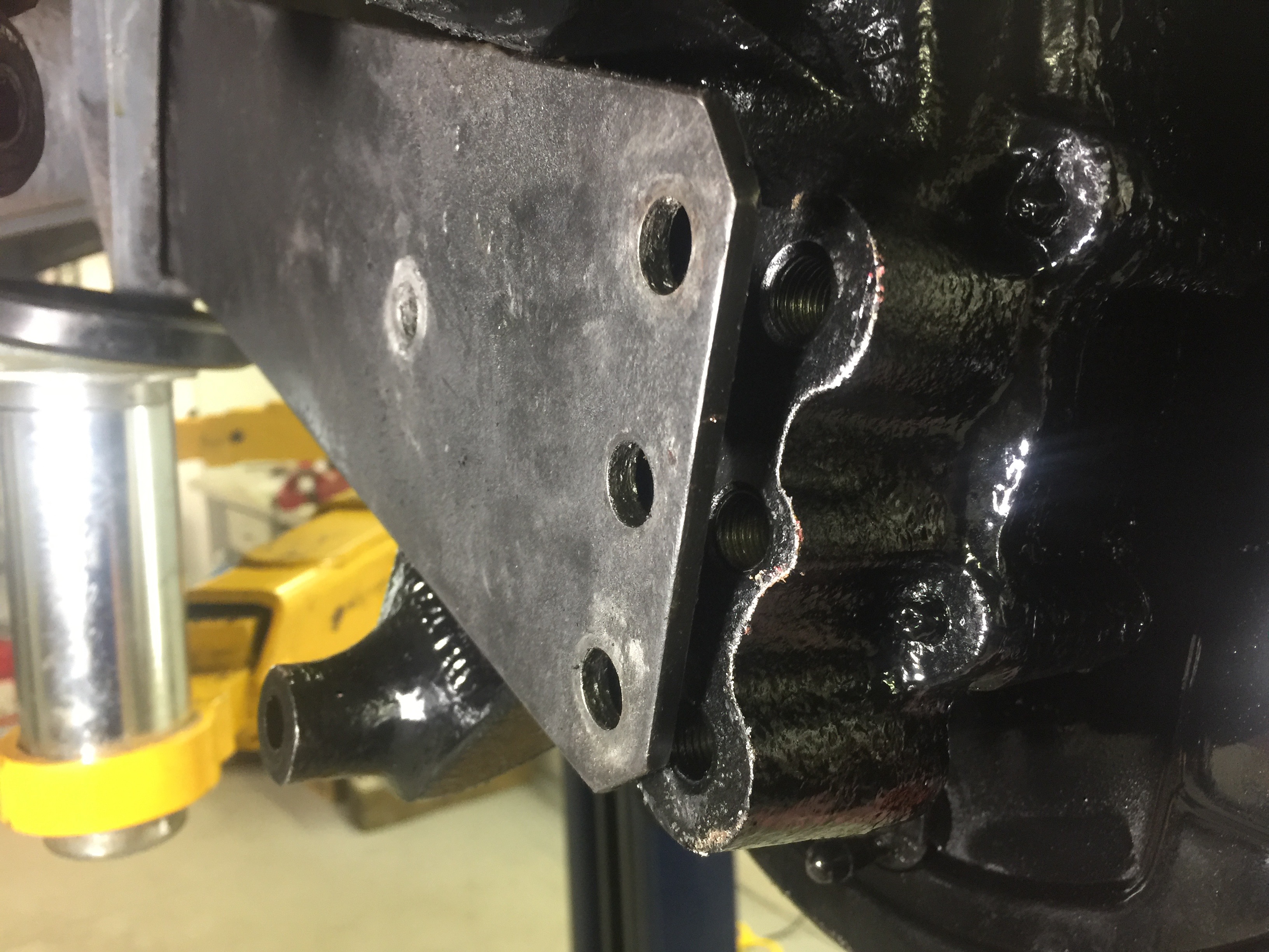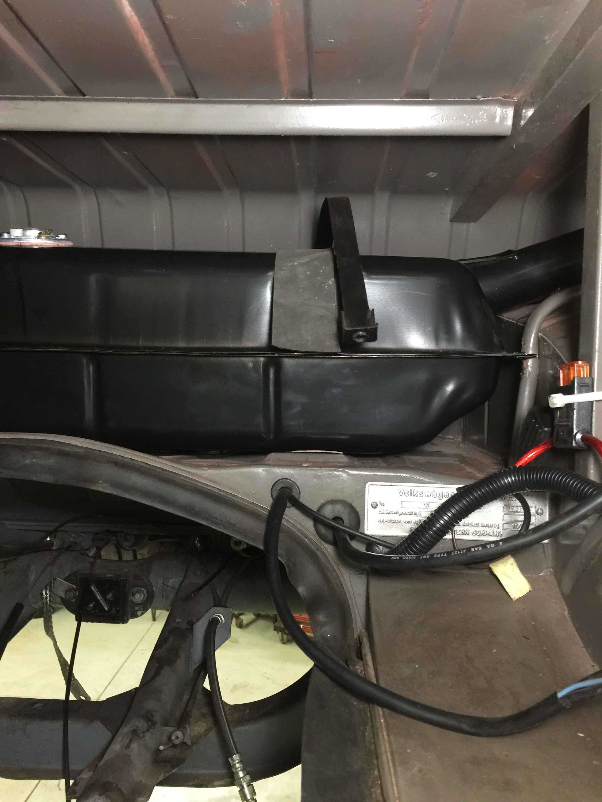 It was a great lessson. We got the new tank in and although it went in like butter, the replacement tank has the fuel outlet about 2 inches off the original, but no big deal. Bruce hooked me up with some great rubberized support for tank and straps. Got the tranny in with Bruce using the Big M*&%$#( channel locks to pull tranny and mount together. We got the spring plates lined up with RGB's using C clamp and persuasion. Good lesson for me. Everything bolted in.