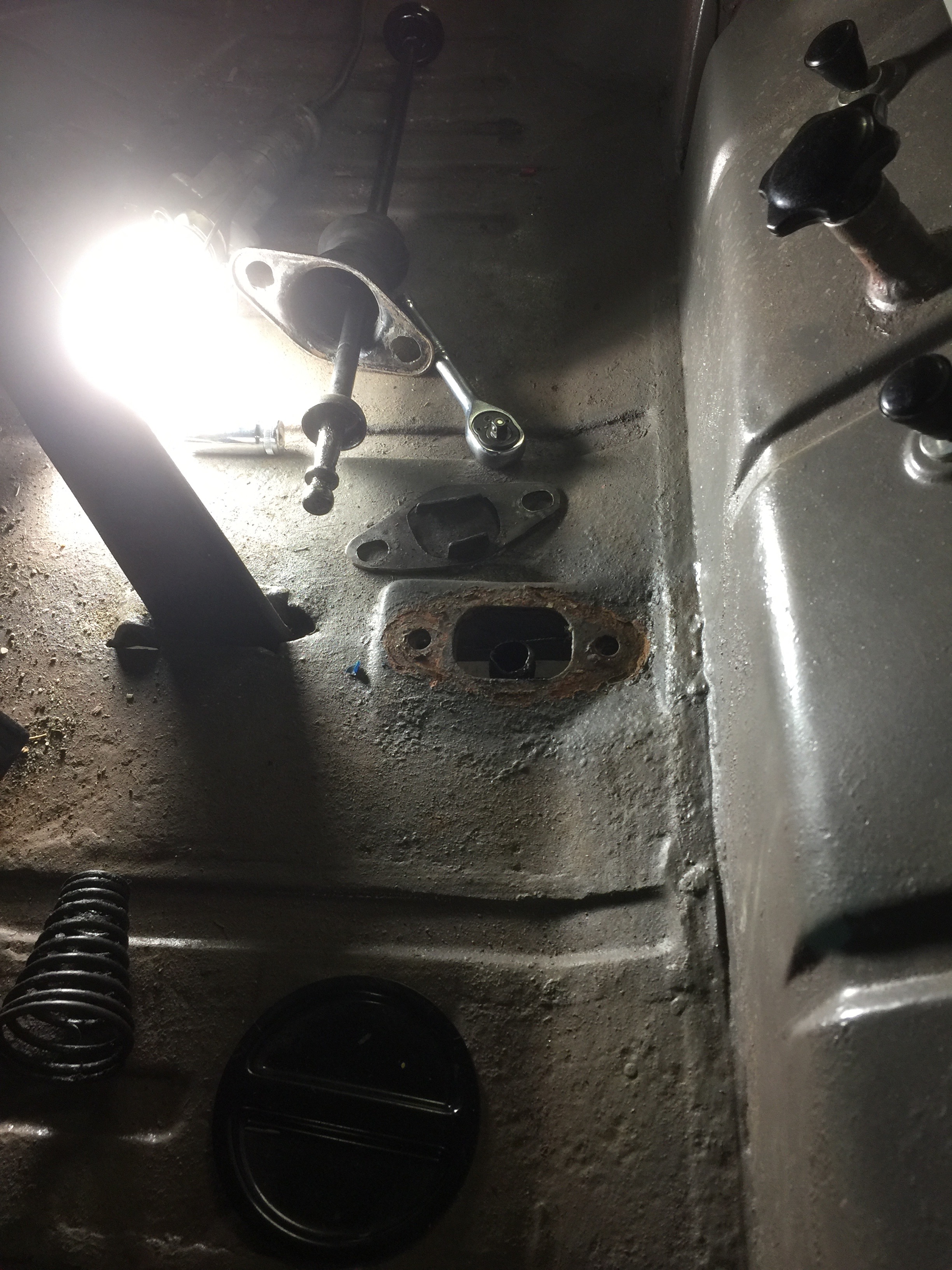 Back at it today. Still working through some issues. The shifter is somewhat out of whack. Well, it may not actually be the shifter, but the symptom shows up in the shifter. This problem existed with the old small nut and remains with the big nut. The symptom is as follows: When you're in neutral and you move the shifter all the way to the left in preparation to put the bus in first gear, the shifter moves too far to the left. In effect, 1st gear ends up being about 1 inch to the right of the full stop for the shifter on the left. It's fine, if you know that reality, but if you're not familiar with it it will drive you crazy looking for 1st gear. Bruce played around with the shift plate and even swapped it, but the results are still the same. There may well be something out of whack in the rod downstream or at the back coupler causing this, but it's beyond my comprehension.