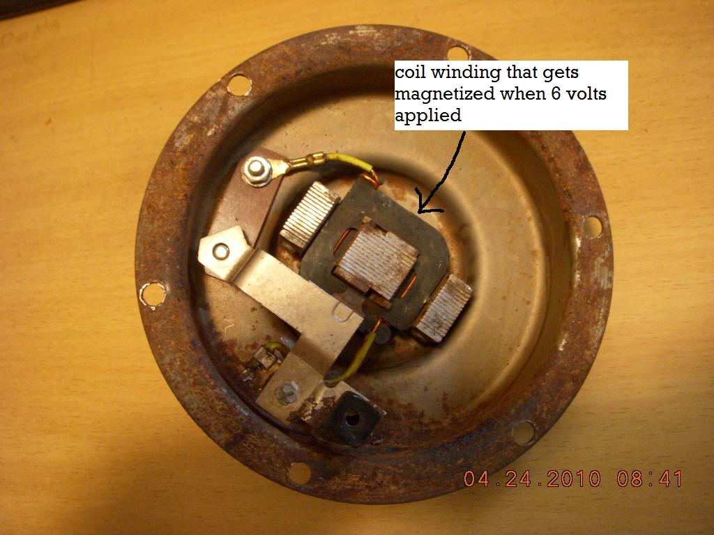 When power 6v or 12v is applied to the horn a coil pack is magnetized which causes the bar on the thin buzzer plate to be drawn towards the now magnetized metal block on either side of the coil pack. As the plate approaches the magnet it then contacts the tab on the point plate, which in turn breaks contact with the points turning the power off to the coil pack. This happens very rapidly causing the metal plate to jump back and forth shaking the buzzer plate and making noise/vibration.