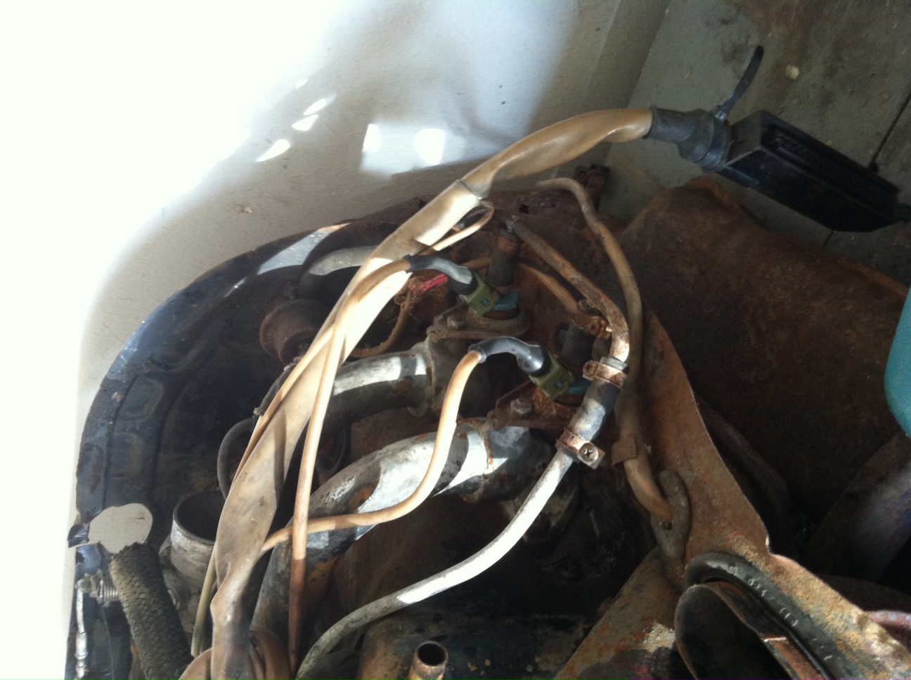 The engine has relatively clean oil, one quart low and a slightly burnt red wire on the right rear of the engine.