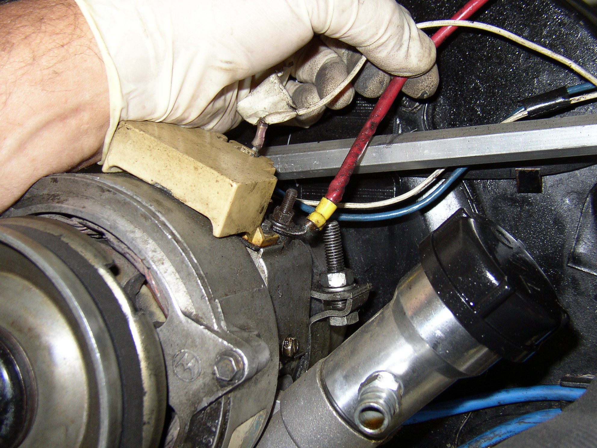 The Alt hot feed was rubbing on the throttle cross bar and just making its way through the insulation. It had a funny little shadow where it was trying to ground and by the melted/swelled up spot on the backside it was caught just in time. The eyelet was loose on the end of the wire, too- I could pull the wire in and out a bit. Yech. By the deformed insulation it looks like it was getting hot, too. More to come.