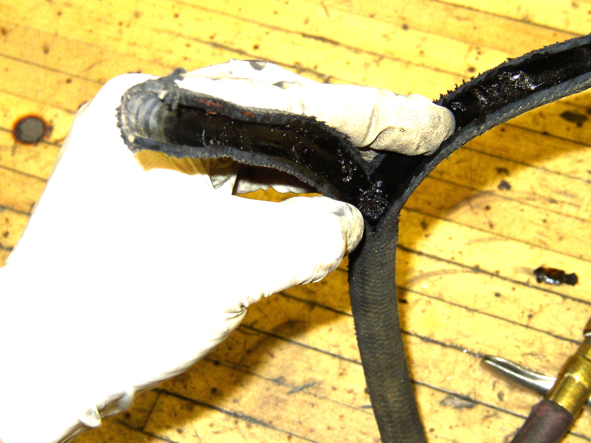 You flatten the football and slide it in place just behind the nose, this is best done with the harness out as the main harness runs right through here. There's enough structure just behind it to push forward and push the dent out. While the football is expanded you take a body hammer and lightly tap all around the creases to remove fatigue and help keep the dent from returning when the ball is deflated. It's not perfect but it is much better.