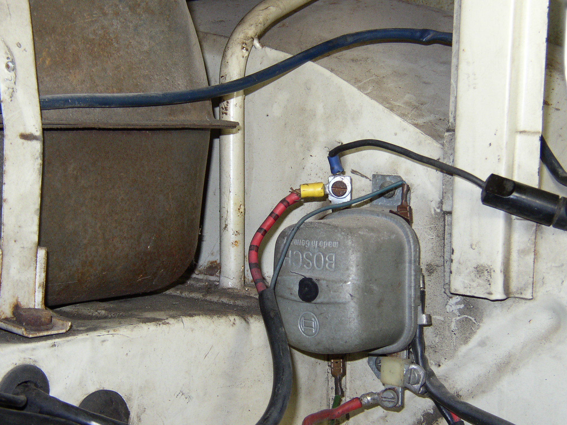Here's an unfused 10ga wire rubbing on a bracket, ready to short out and start a fire. Voltage regulator feed wire, yech. Coil feed, yech.