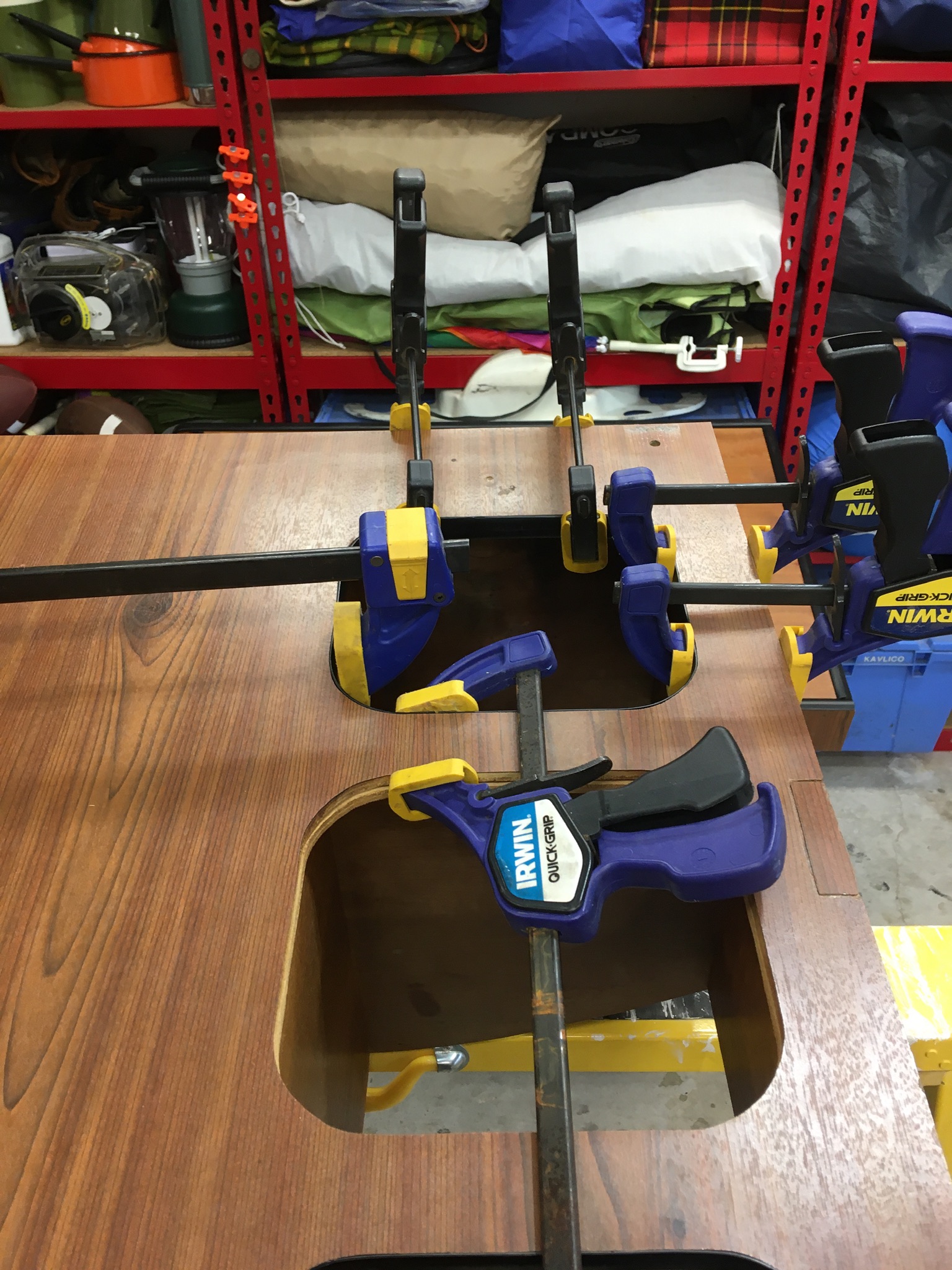 While the cabinets were out I thought I should repair all the loose laminate and trim. Some contact cement and a lot of clamps.